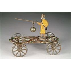 “THE BOY SCOUT” BELL TOY. Manufactured by The Gong Bell Co. An extremely rare bell toy (1 of 2 known) of a Boy Scout dressed in regulation scout uniform of the time with an extended pole which would have had a paper American Flag attached. Upon close inspection, the cast iron base is composed of a fanciful casting of simulated branches with crossed muskets at the Scout’s feet. SIZE: 7”. CONDITION: Silver paint on base and figure’s face both show oxidation. Scout’s yellow uniform is in fine paint. JL 1-4102 (3,000-4,000)