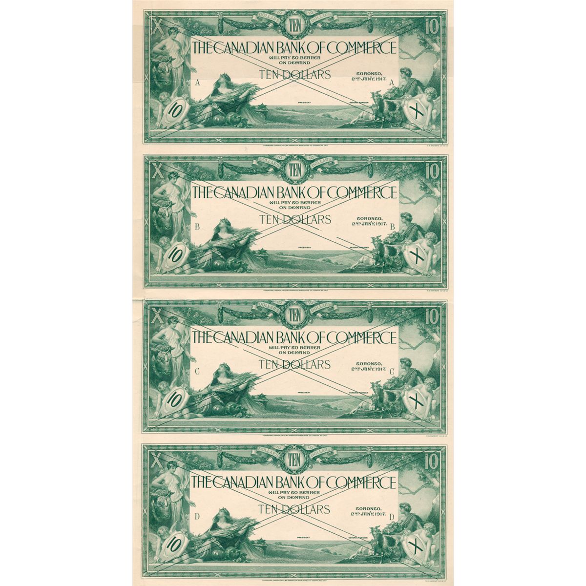 THE CANADIAN BANK OF COMMERCE. $10.00. 2nd. Jany. 1935. CH-75-18-06P. An uncut sheet of four Black and White Face Proofs, attached vertically, on thin paper. The Proofs have been printed from cancelled dies and have been folded down the middle and there are a few minor defects, otherwise the sheet is Extra Fine.