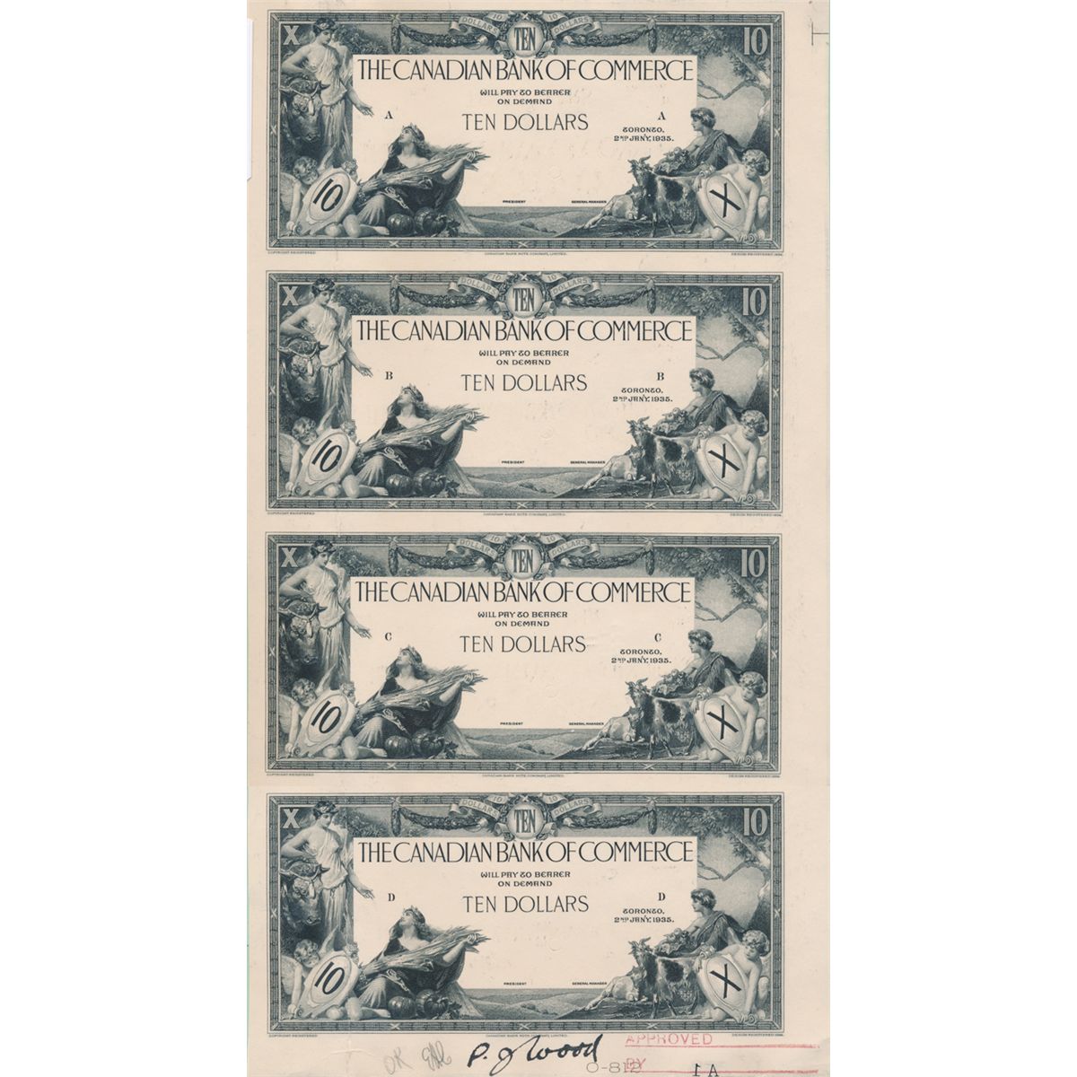 THE CANADIAN BANK OF COMMERCE. $10.00. 2nd. Jany. 1935. CH-75-18-06P. An uncut sheet of four Black and White Face Proofs, attached vertically, on thin paper. The Proofs have been folded down the left side and there are a few minor defects, otherwise the sheet is Extra Fine. Approval initials at bottom center.