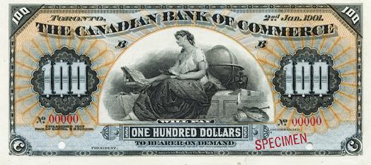 THE CANADIAN BANK OF COMMERCE. $100.00. Jan. 2, 1901. A date with no known issued notes. CH-75-14-58S. A choice SPECIMEN. Ex. Smythe/Strasbourg. Sept. 14, 2002. Lot #2776.