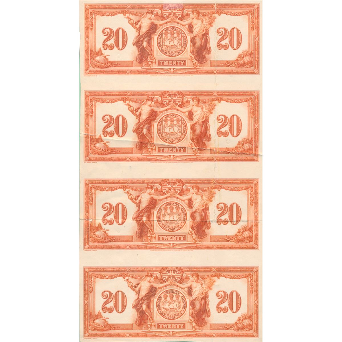 THE CANADIAN BANK OF COMMERCE. $20.00. 2nd. Jany. 1917. CH-75-16-02-08P. An uncut sheet of four Back Proofs, in orange tint, attached vertically, on thin card. The Proofs have been folded down the middle and there are a few minor defects, otherwise the sheet is Extra Fine.