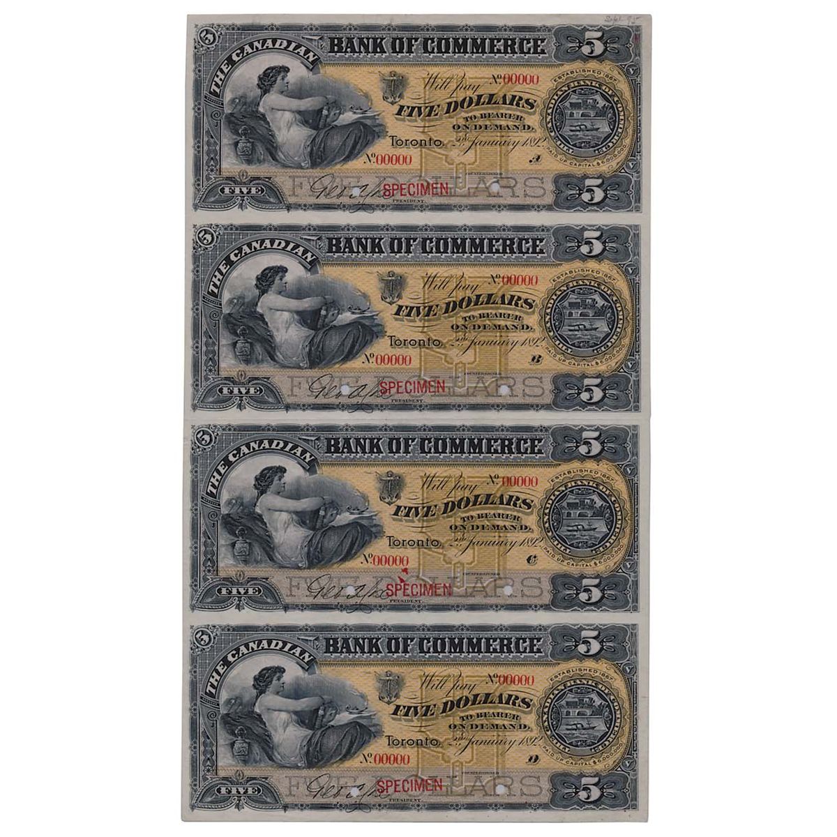 THE CANADIAN BANK OF COMMERCE. $5.00. Jan., 1892. CH-75-14-04S. An uncut sheet of four Specimen notes. Imprint at right. Serial No. 00000 in red and overprinted ‘SPECIMEN’ in red at signature panels. PMG graded Choice Unc-64.