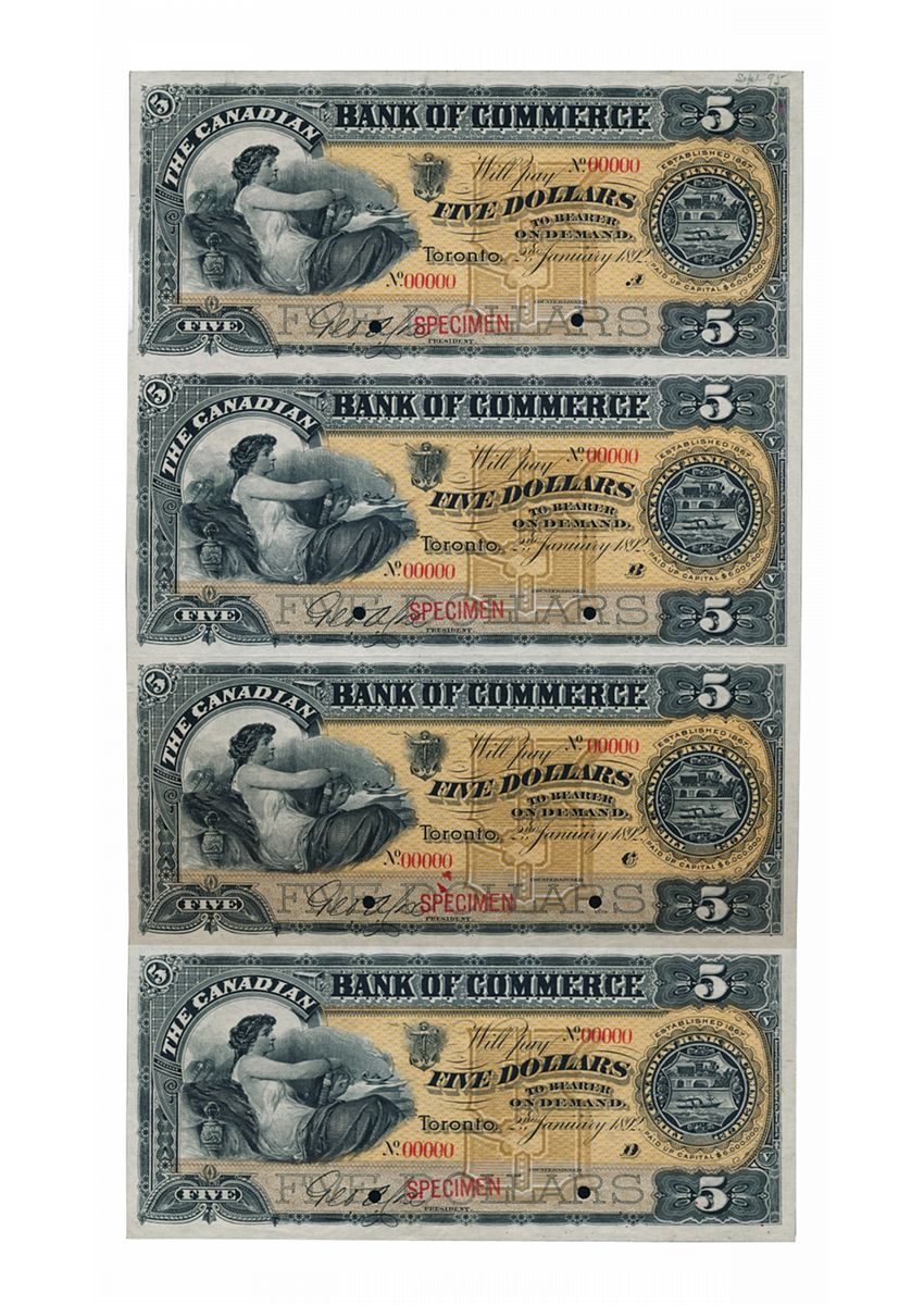 THE CANADIAN BANK OF COMMERCE. $5.00. Jan. 2, 1892. CH-75-14-04S. An uncut sheet of four Specimen notes. Imprint at right. Serial No. 00000 in red and overprinted ‘SPECIMEN’ in red at signature panels. PMG graded Choice Unc-64.