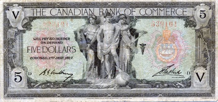 THE CANADIAN BANK OF COMMERCE. $5.00. Jan. 2, 1917. CH-75-16-04-02. Red Serial No. 639101/D. Signed Walker- Aird. CBN Imprint. VG.
