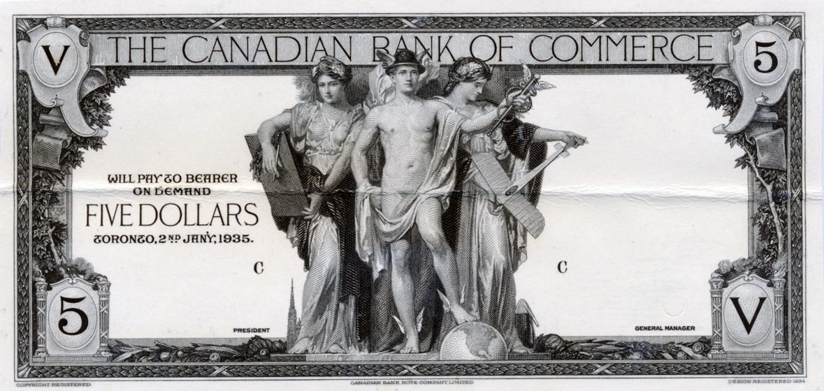 THE CANADIAN BANK OF COMMERCE. $5.00. Jan. 2, 1935. CH-75-18-02P. A Black and White Face Proof on a thick card. Horizontal fold along the center. Otherwise AU.