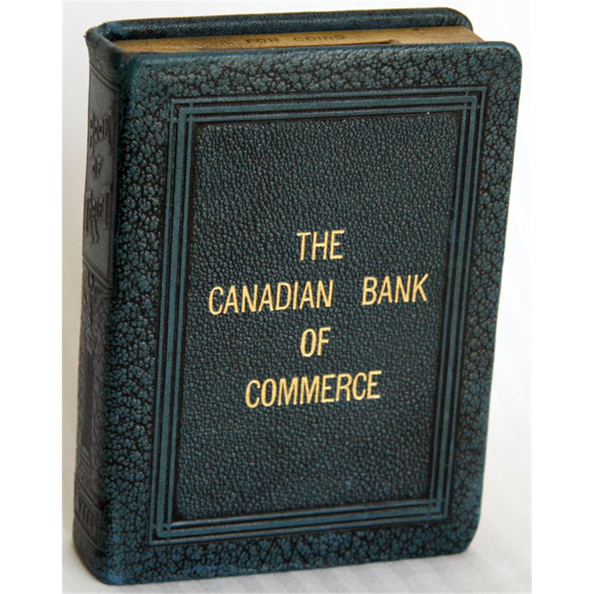 THE CANADIAN BANK OF COMMERCE. ‘BOOK OF THRIFT’ on spine. Coin opening on top. Key lock, key present. No serial number. 12cm x 8cm x 2 1/2cm. ‘Book of Thrift’ on spine. Cloth cover, with gold embossed bank name. Maker-Bankers Utilities, San Francisco, USA. U.S.A. patented July 3, 1923. VF.