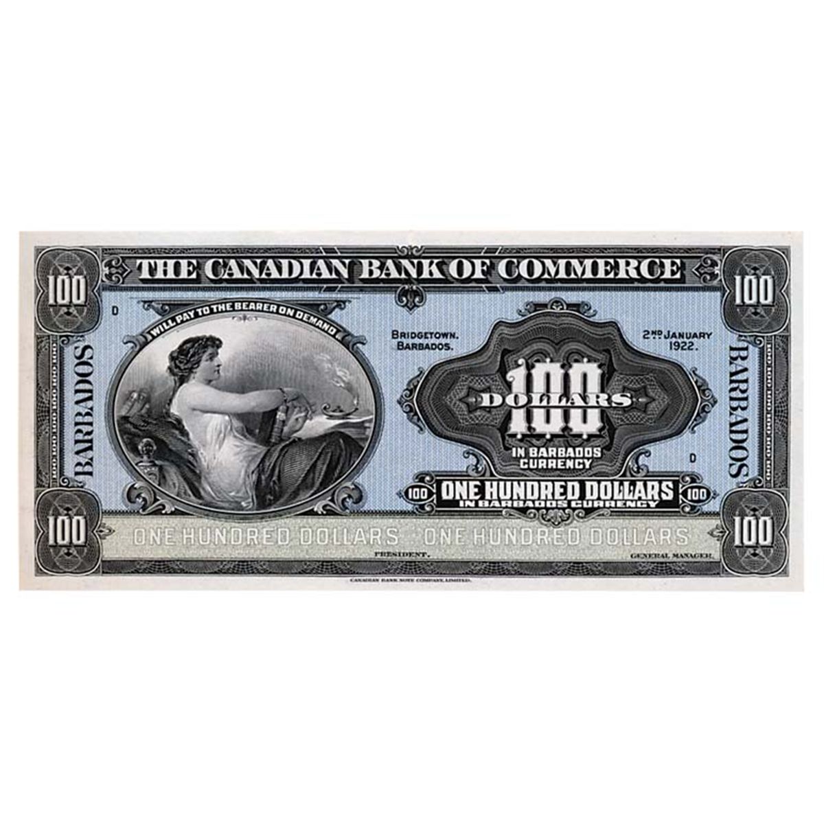 THE CANADIAN BANK OF COMMERCE. Bridgetown, Barbados. $100.00. 2 Jan., 1922. CH-75-20-10P. Full Colour Face and Back Proofs on a large approval cards. Both pristine.