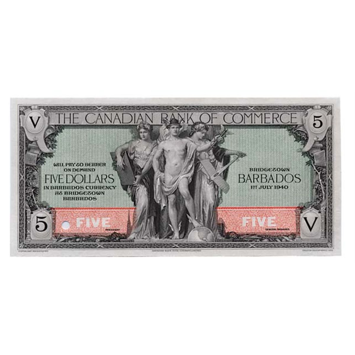 THE CANADIAN BANK OF COMMERCE, Bridgetown, Barbados. $5.00. July 1, 1940. CH-75-22-02p. A full colour Face Proof, on thin card.