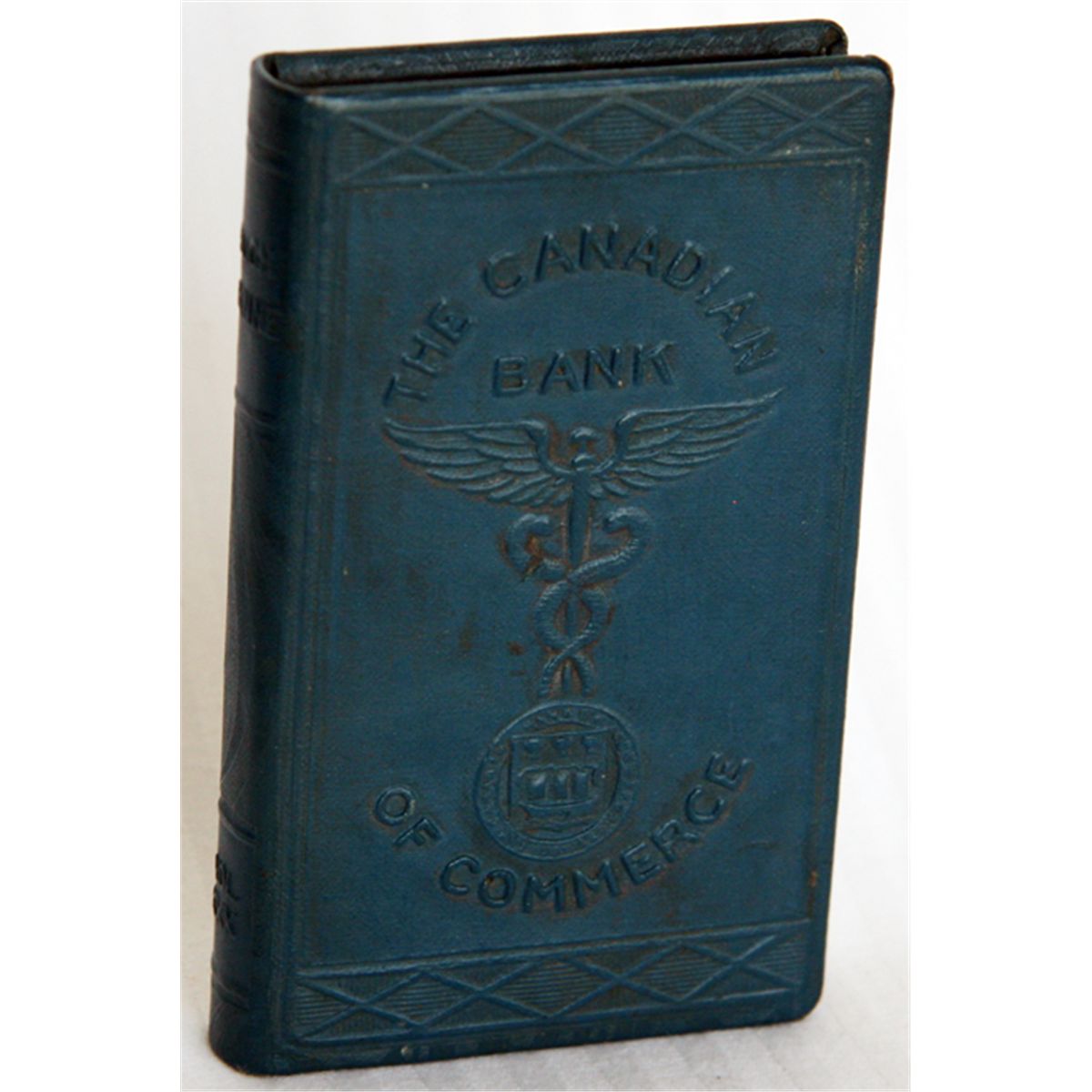 THE CANADIAN BANK OF COMMERCE. Small book shaped. Coin opening on top. Key lock. No key present. No serial number. 10cm x 6cm x 1cm. ‘Hugh Wynn, Vol. XXX’ on spine. Dark green cloth or leatherette cover. Maker-unknown. No patent information. VF.