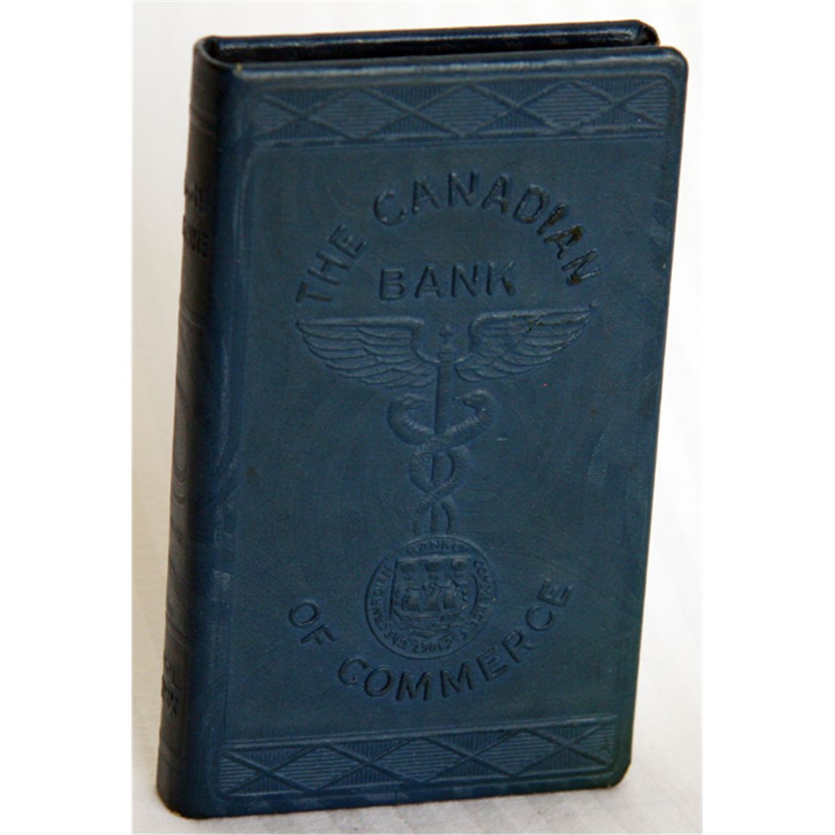THE CANADIAN BANK OF COMMERCE. Small book shaped. Coin opening on top. Key lock. No key present. No serial number. 10cm x 6cm x 1cm. ‘Hugh Wynn, Vol. XXX’ on spine. Light green cloth or leatherette cover. Maker-unknown. No patent information. VF.