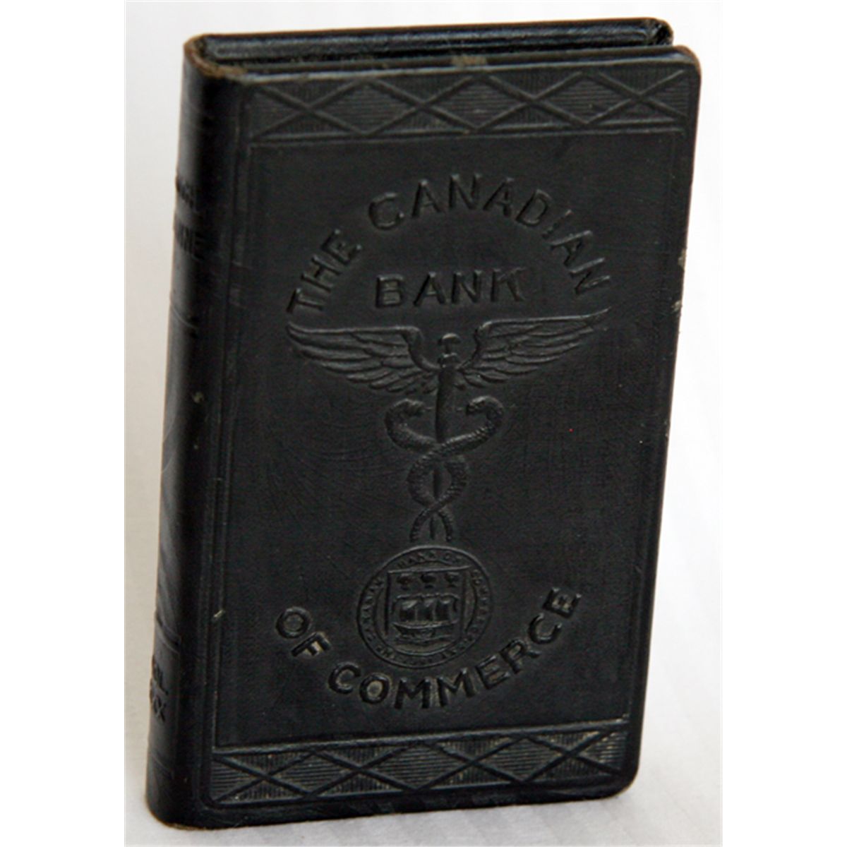 THE CANADIAN BANK OF COMMERCE. Small book shaped. Coin opening on top. Key lock. No key present. No serial number. 10cm x 6cm x 1cm. ‘High Wynn, Vol. XXX’ on spine. Black cloth or leatherette cover. Maker-unknown. No patent information. VF.