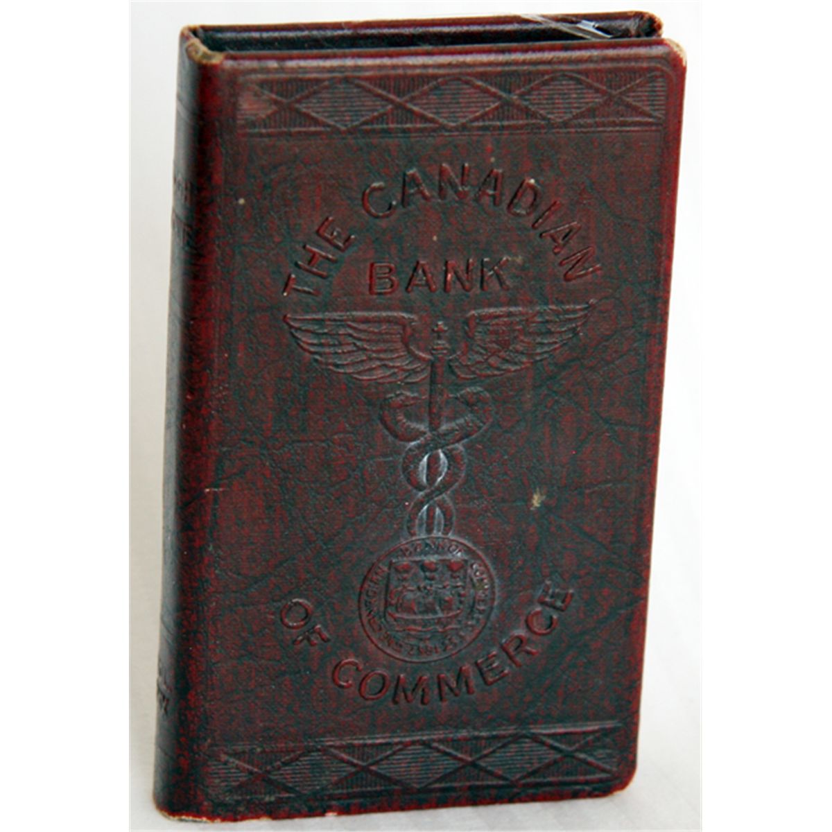THE CANADIAN BANK OF COMMERCE. Small book shaped. Coin opening on top. Key lock. No key present. No serial number. 10cm x 6cm x 1cm. ‘Hugh Wynn, Vol. XXX’ on spine. Deep Maroon cloth or leatherette cover. Maker-unknown. No patent information. VF.