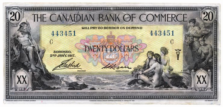 $20.00. Jan. 2, 1917. CH-75-16-04-20a. Small Logan. No. 443451/C. PMG graded AU-55 EPQ. Bright, with vibrant colours.