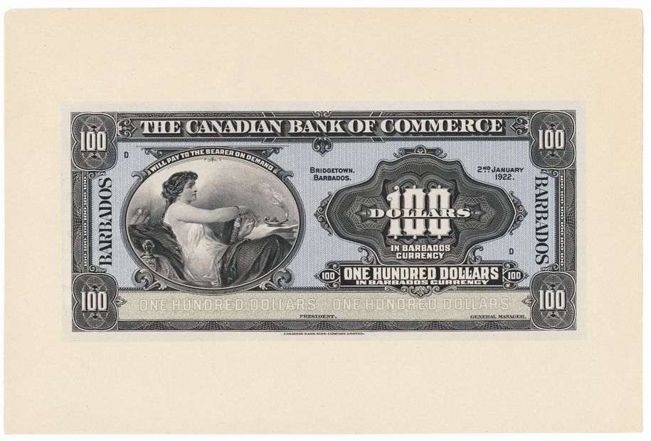 Bridgetown, Barbados. $100.00. Jan. 2, 1922. CH-75-20-10P. Full colour Face and Back Proofs on large (9”” X 6””) approval cards. Beautiful center vignette of a seated woman with book and lamp. Two pristine Proofs.