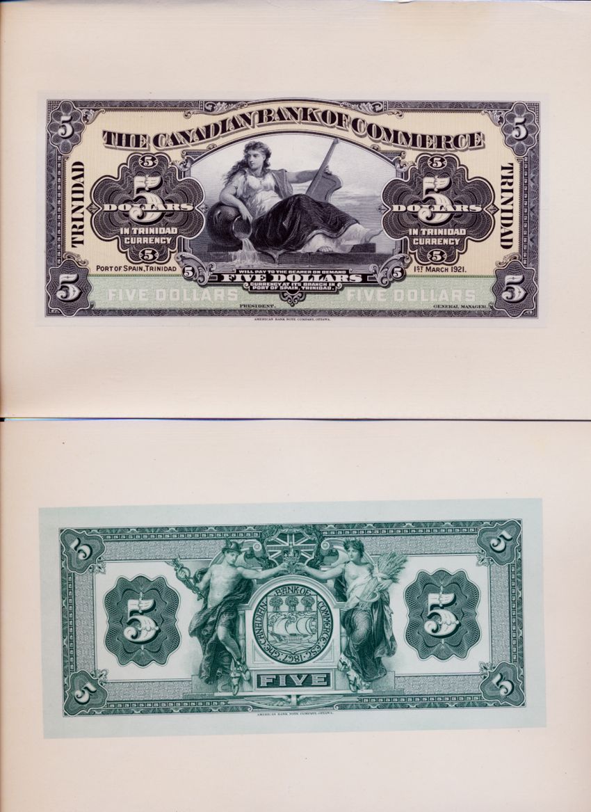 THE CANADIAN BANK OF COMMERCE. Port of Spain, Trinidad. $5.00. March 1, 1921. CH-75-28-02P. Full colour Face and Back Proofs, on large (9” x 6”) approval cards. Center vignette of a seated woman with lyre and spilling water from a jug. Both Proofs are pristine.