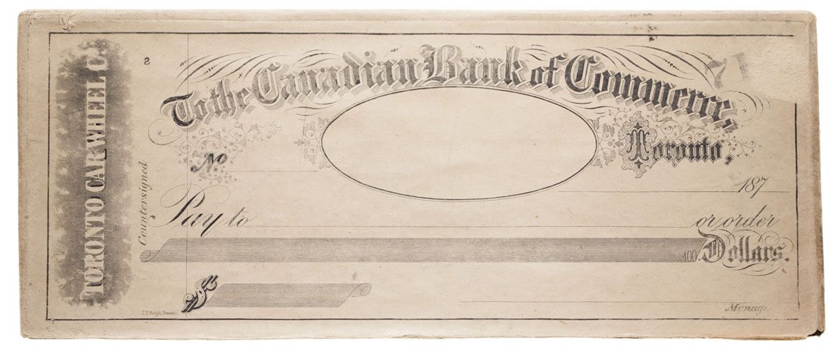 187_. A mirror image copper plate for cheques. "To the Canadian Bank of Commerce, Toronto". "Toronto Car Wheel Co", vertically at left. Red-brown patina. Mesaures 3.5" x 9". Imprint on front "J.Rolph, Toronto" in very small letters.