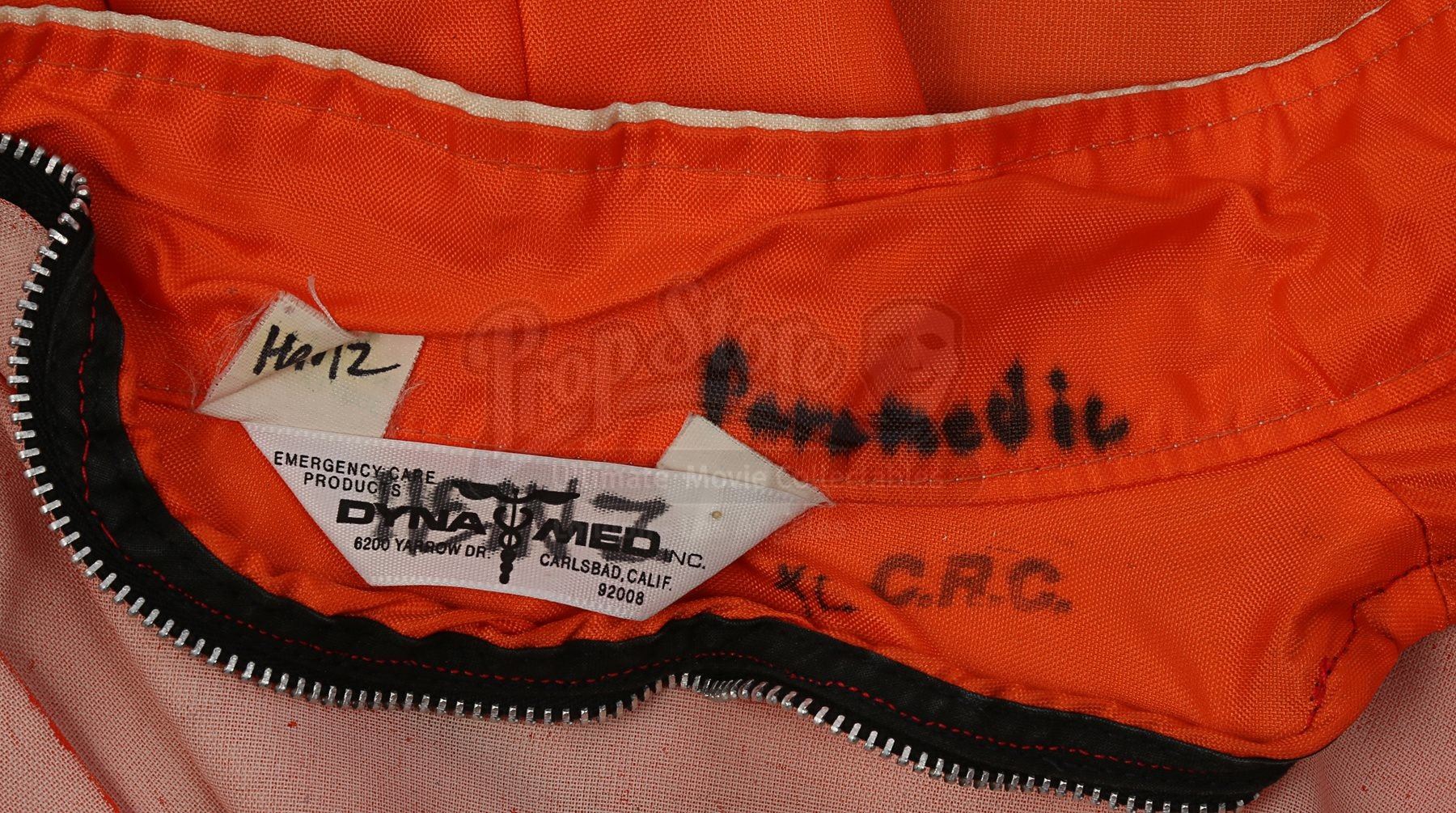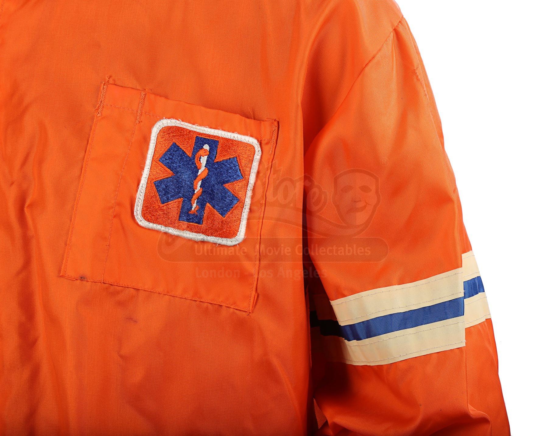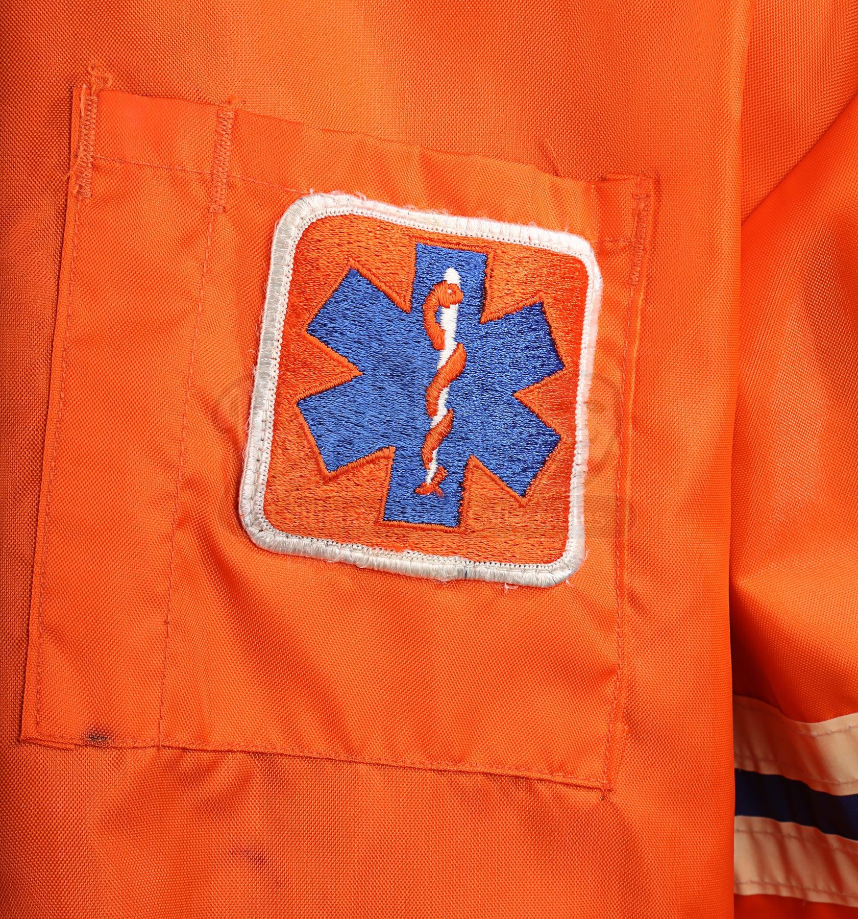 Constructed from Nylon, the bright orange jacket (marked size “XL”) features an embroidered patch sewn to the left breast pocket. Each sleeve has a blue-and-white striped band, and three pockets adorn the front. Handwritten on the interior collar is “Paramedic”. Accompanying the jacket is a certificate of authenticity from the costume suppliers and an original wardrobe production tag. The garment shows age and wear, including stains on the front and collar, and discolouration on the arm cuffs. Two labels reading “Heinz” and stitch holes on either sleeve remain from use in a subsequent production.