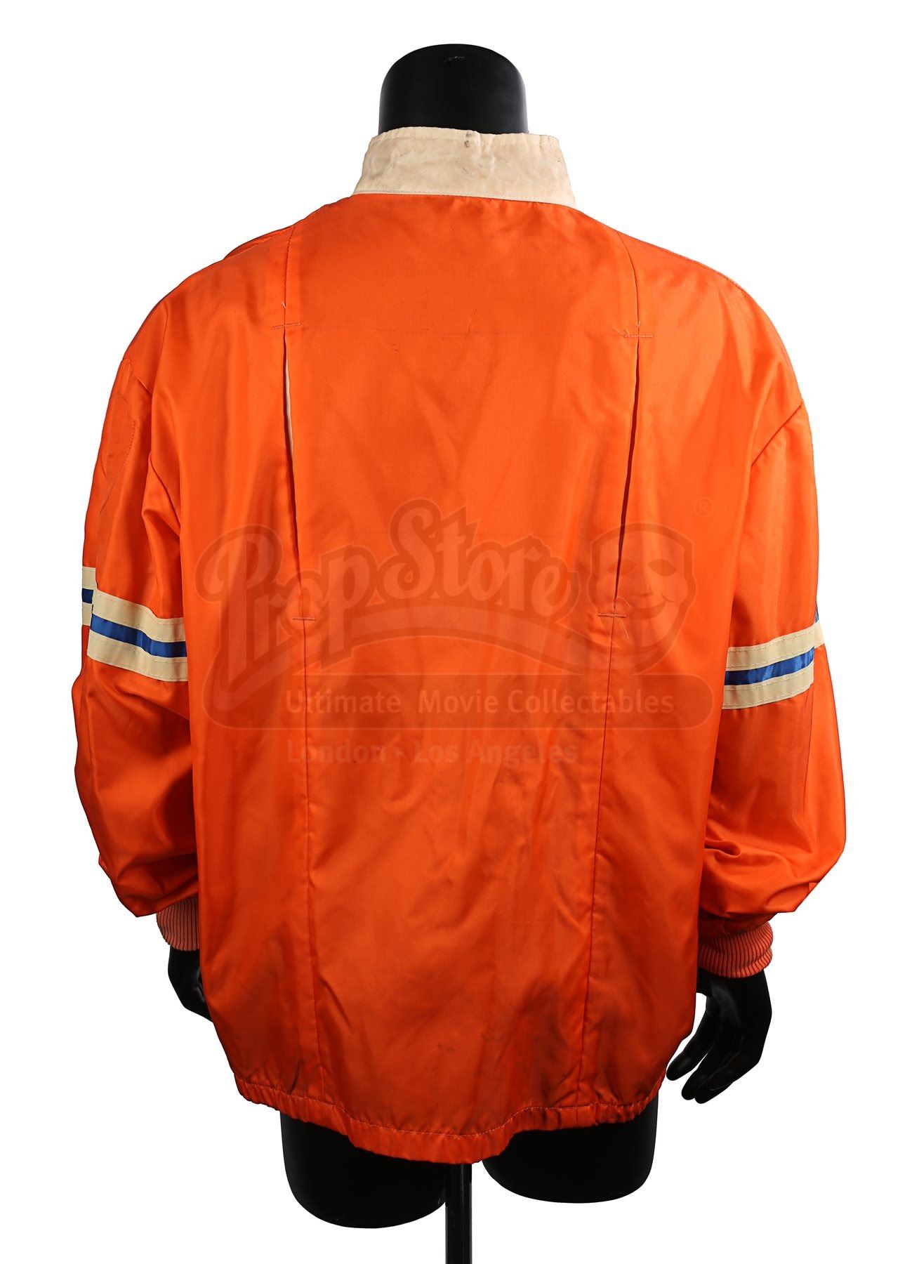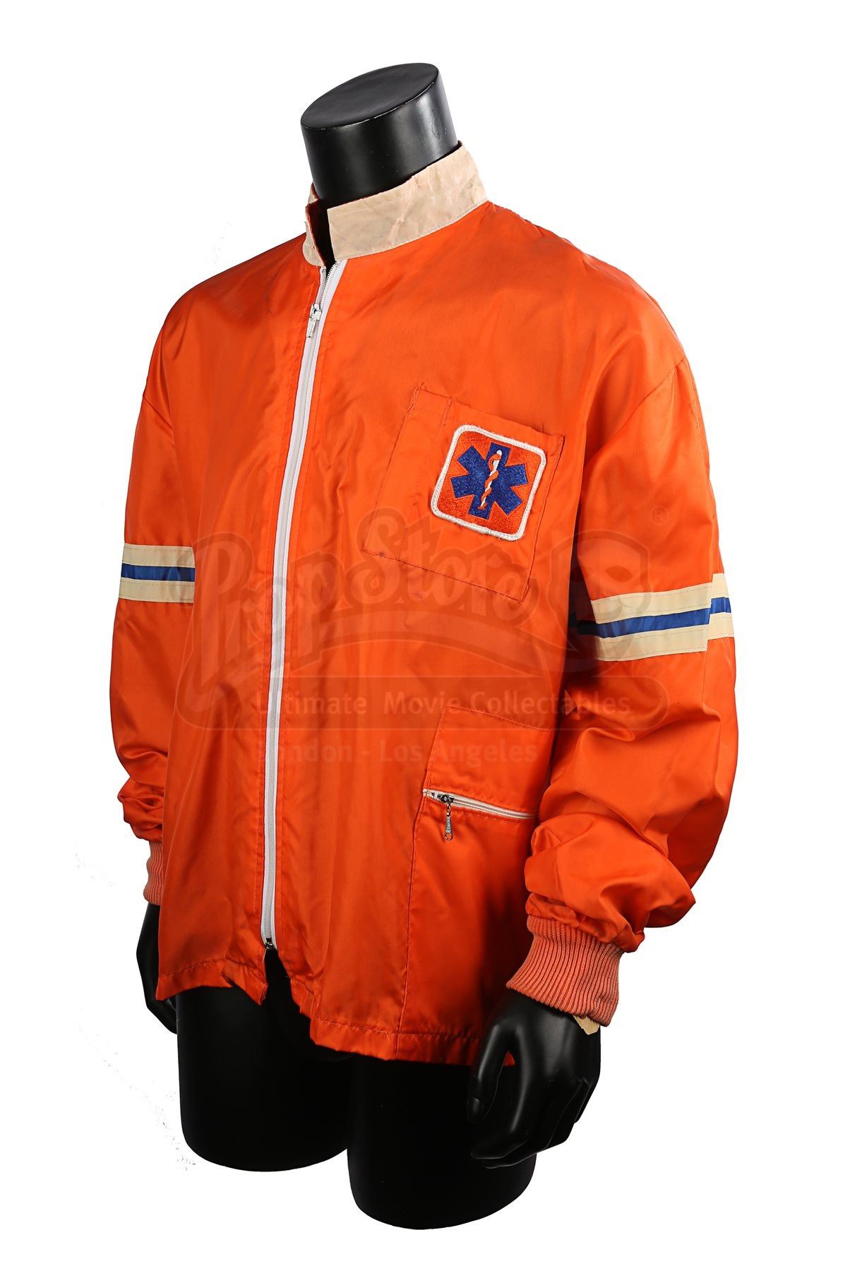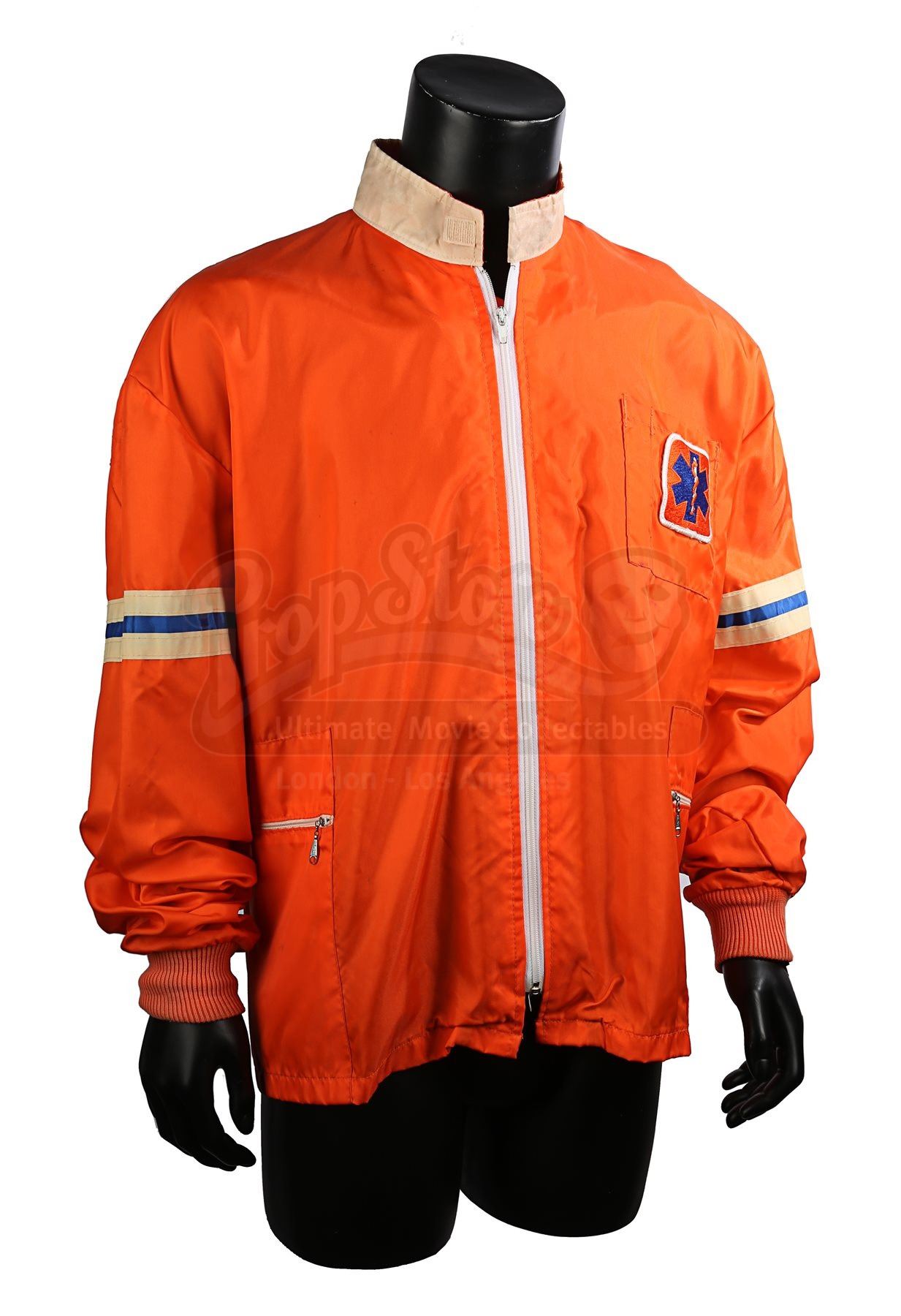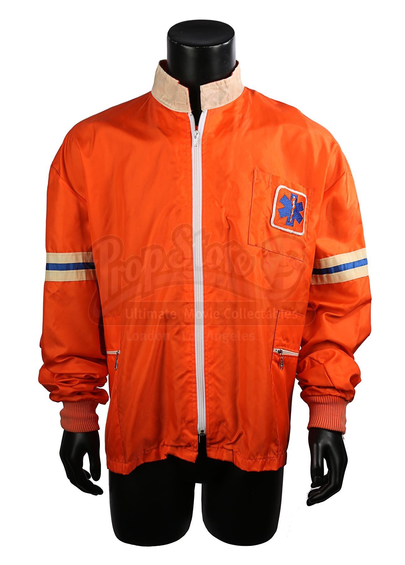Constructed from Nylon, the bright orange jacket (marked size “XL”) features an embroidered patch sewn to the left breast pocket. Each sleeve has a blue-and-white striped band, and three pockets adorn the front. Handwritten on the interior collar is “Paramedic”. Accompanying the jacket is a certificate of authenticity from the costume suppliers and an original wardrobe production tag. The garment shows age and wear, including stains on the front and collar, and discolouration on the arm cuffs. Two labels reading “Heinz” and stitch holes on either sleeve remain from use in a subsequent production.