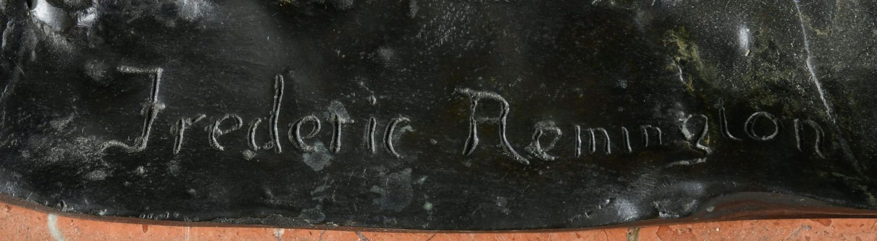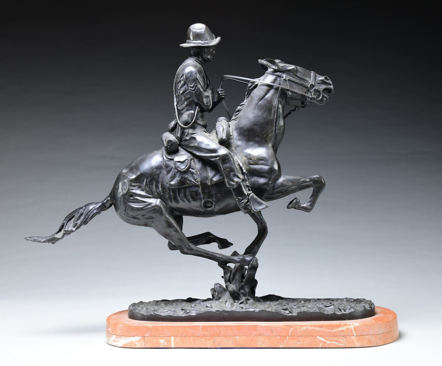 The patinated bronze casting signed on the base "Frederic Remington". Depicting a cavalry man on a rearing horse joined to a oval rockwork plinth on a marble base. SIZE: statue only 21 1/2" h x 25" l. overall 23" x 26 1/2", statue is 21 1/2" h x 25" l. CONDITION: very good with original surface. PROVENANCE: Martin Lane Historic & Western Americana Lifetime Collection. (02-25343/MD). NON-GUN. $500-700.