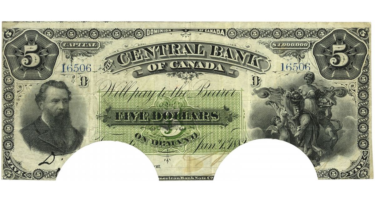 $5.00. Jan. 1, 1884. CH-90-10-02. No. 16506/D. A cancelled note, with two large semi-circular cut outs of bottom through the signatures. Fine+. Stamp hinge on back at top center. Ex. JHA Sale Oct., 1979.