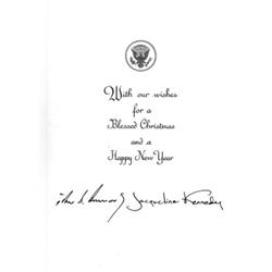 (THE CHRISTMAS CARD THAT WAS NEVER SENT): The Christmas card that was never sent, the official White House Christmas card for 1963 made by Hallmark for John and Jacqueline Kennedy. The card bears a photograph of a crFche scene from the East Room in the White House, with the greeting and Presidential Seal on the facing page. The greeting reads "With our wishes for a Blessed Christmas and a Happy New Year", followed by the printed signatures of John and Jacqueline Kennedy. Also included is the white tissue insert. Following Kennedy's assassination on November 22nd, it was clear that these cards, already printed, could not be used. Fine condition. $300-500