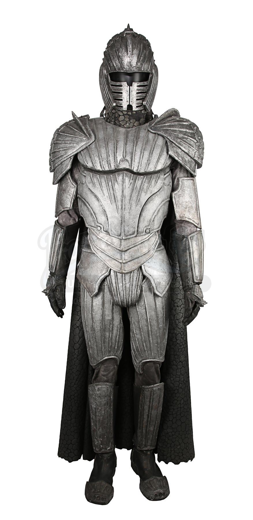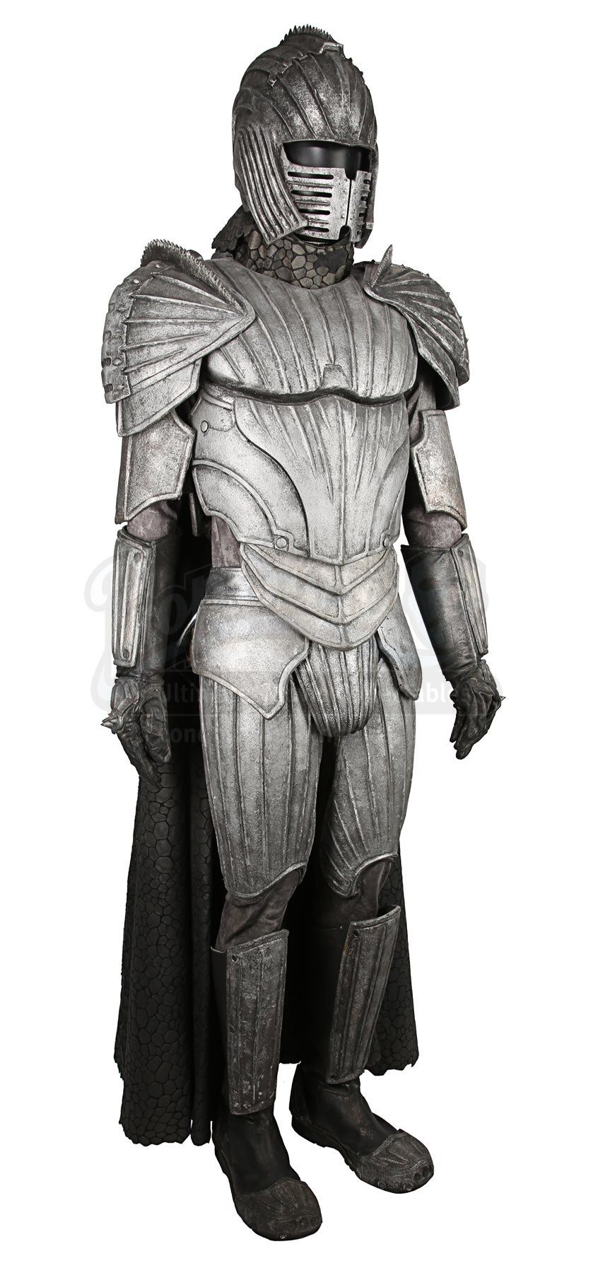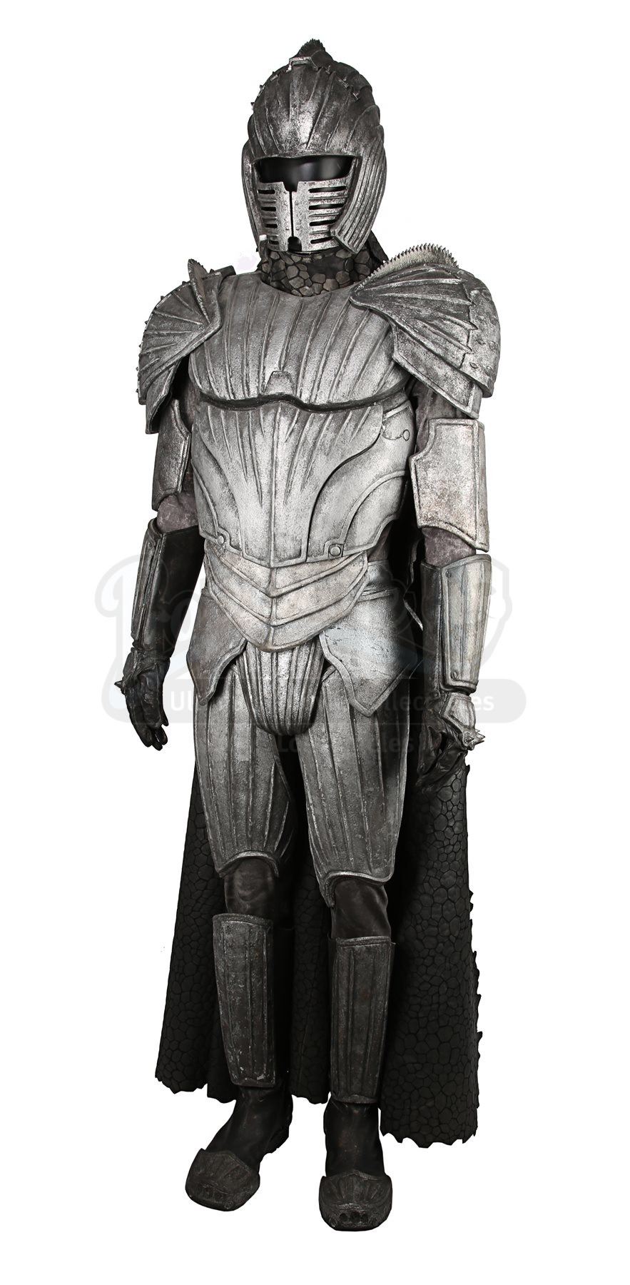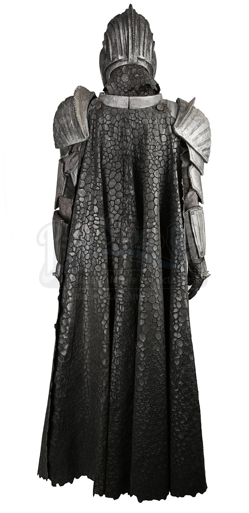 The costume consists of a fiberglass helmet with face guard and spine of spikes along the centre; armoured chest and back sections with spiked plates at each shoulder; a Lycra undersuit with rubber armour panels; a Lycra cowl and full cloak, both with rubber scaled detailing; a faux leather belt with rubber codpiece; leather boots (size 12); and gloves with rubber spikes at the knuckles. The armour has a distressed steel finish, adding to the fearsome look of the costume.