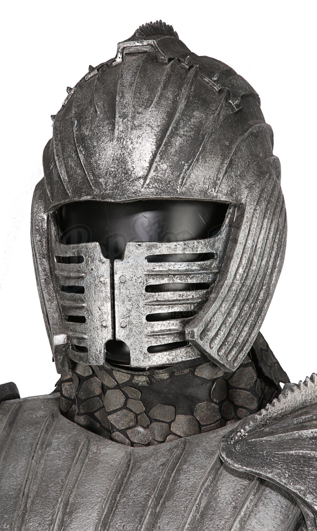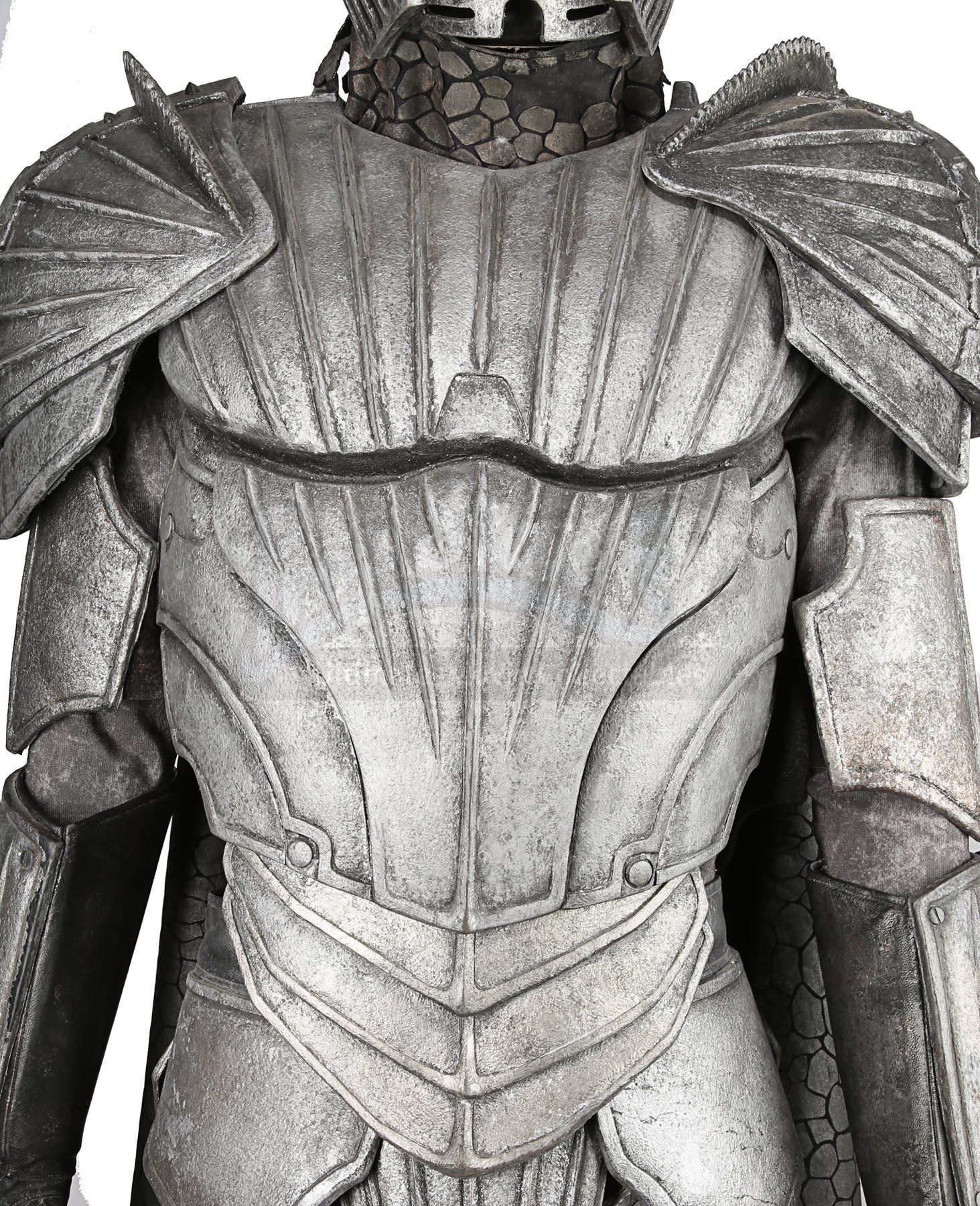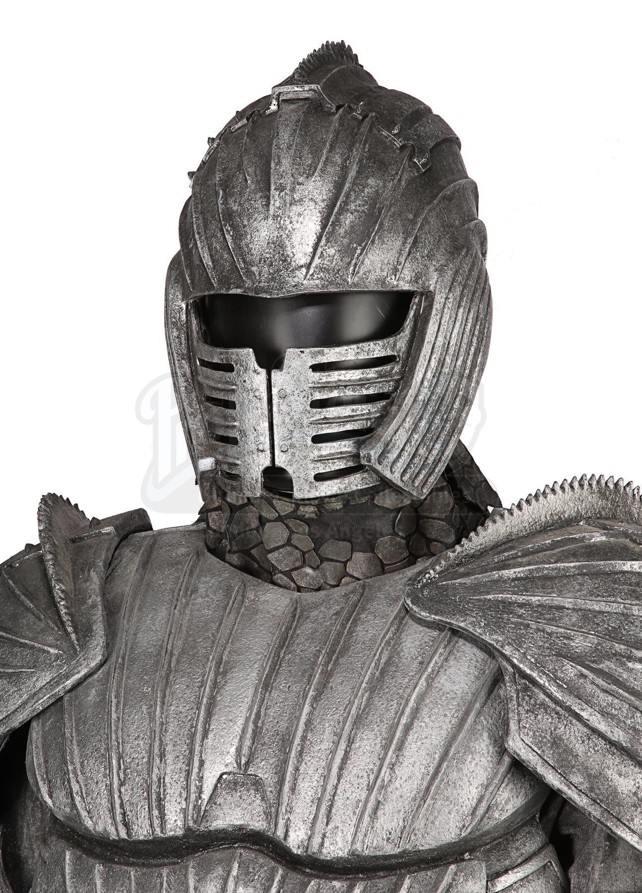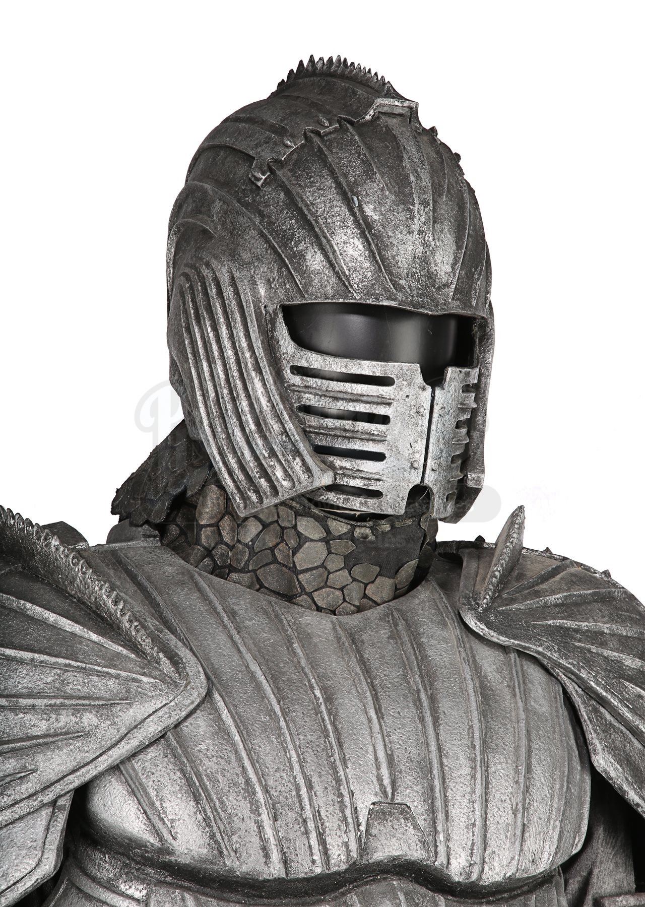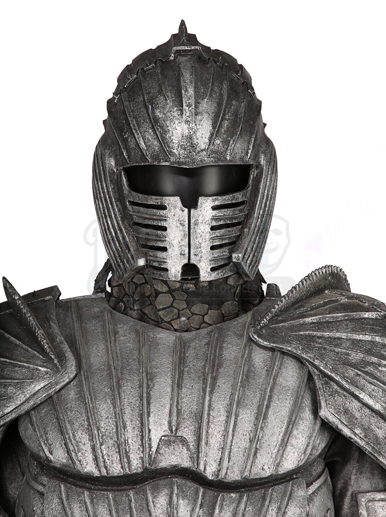The costume consists of a fiberglass helmet with face guard and spine of spikes along the centre; armoured chest and back sections with spiked plates at each shoulder; a Lycra undersuit with rubber armour panels; a Lycra cowl and full cloak, both with rubber scaled detailing; a faux leather belt with rubber codpiece; leather boots (size 12); and gloves with rubber spikes at the knuckles. The armour has a distressed steel finish, adding to the fearsome look of the costume.