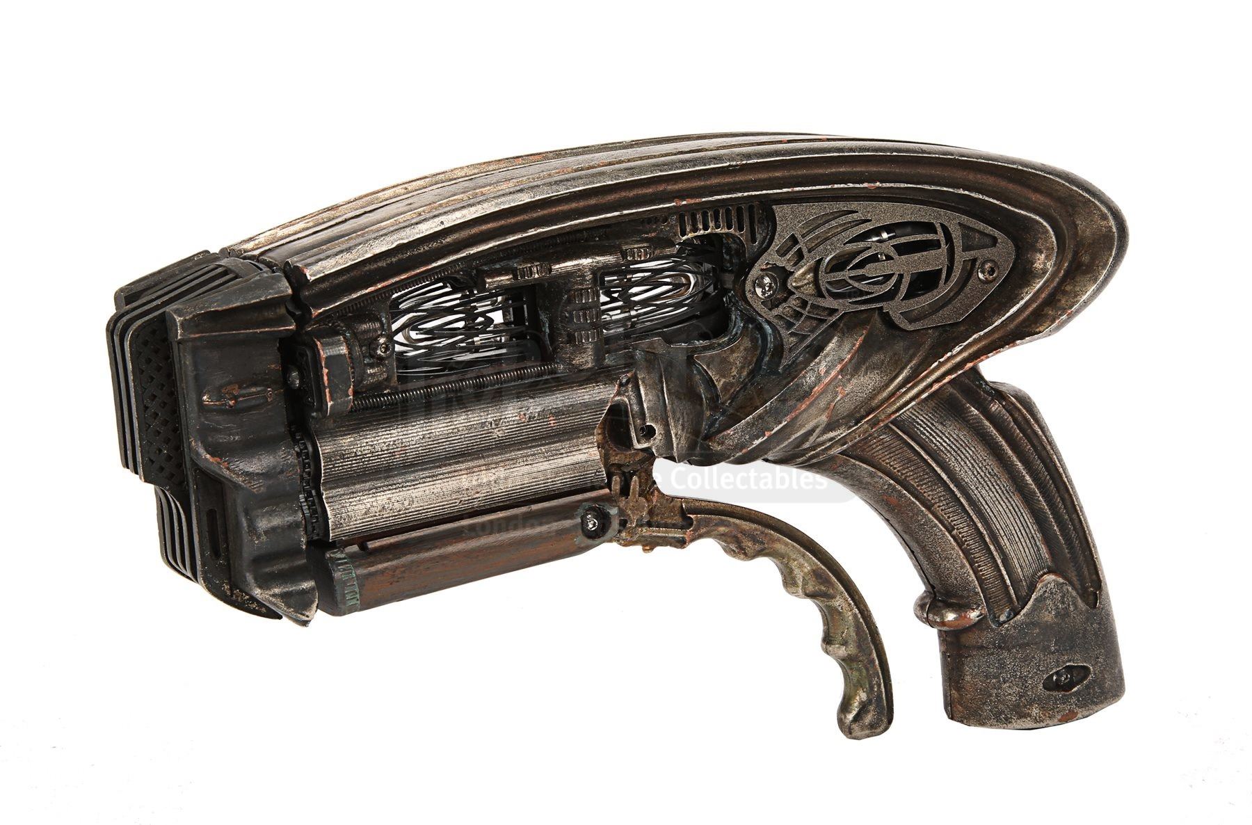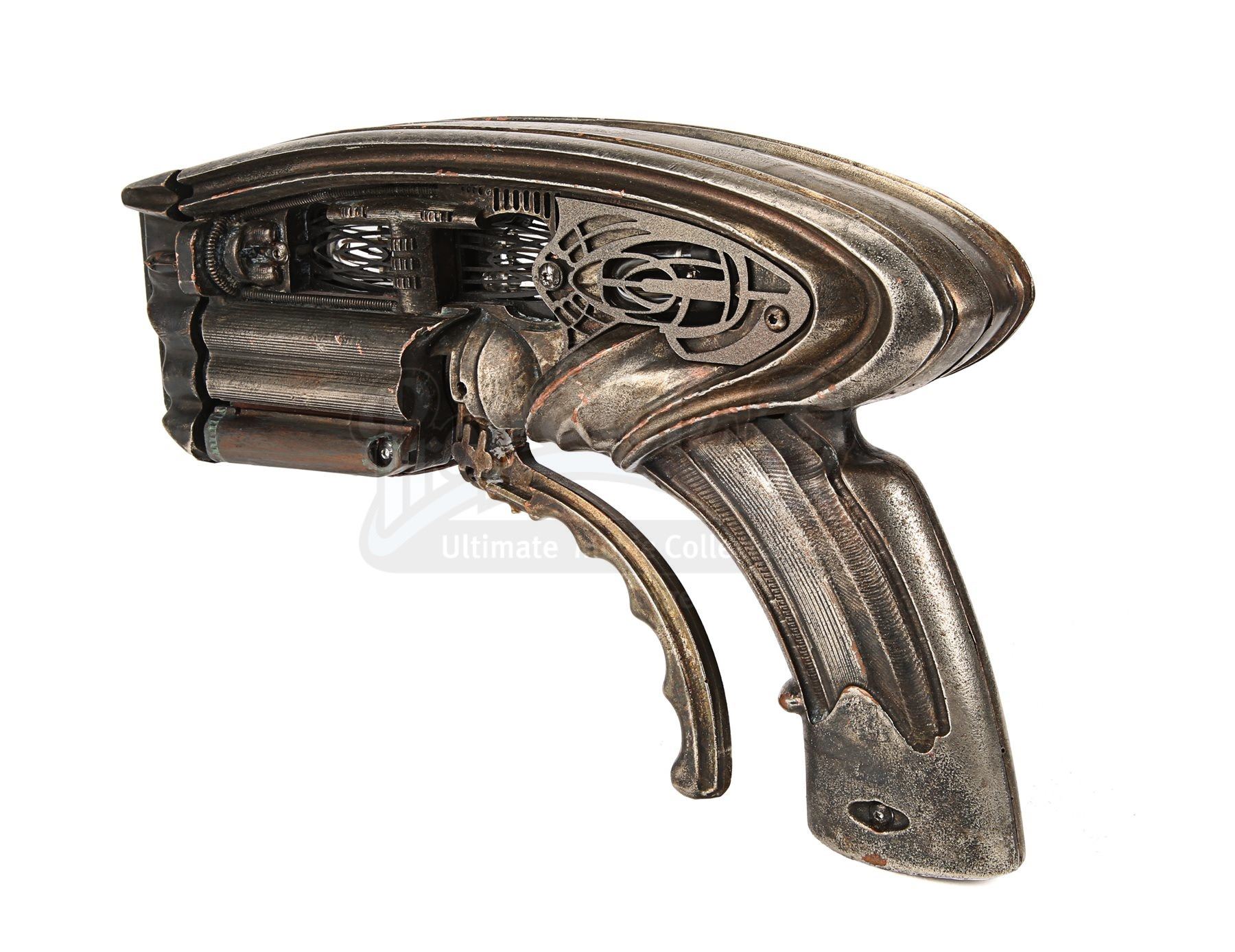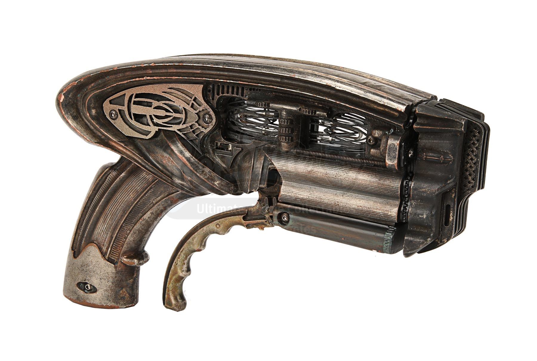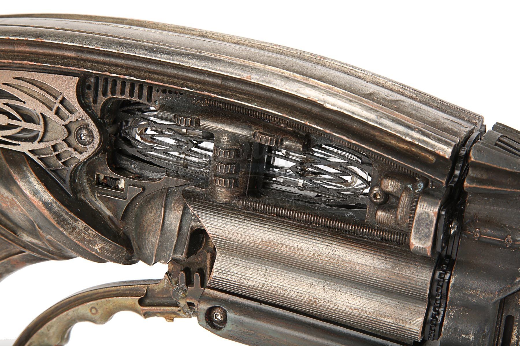 The hero weapon is made of resin, fiberglass and metal with a functioning trigger and light-up action that features quick-firing LEDs housed in the central chamber, powered by two 9v batteries. A small switch on the left side, activates the action. It is highly detailed with an array of ornate designs running down the sides and has had a tarnished steel and bronze-coloured finish in keeping with the design of the Necromonger armour. Displaying wear to the paint finish on the grip and frame from use, the weapon remains in good condition.