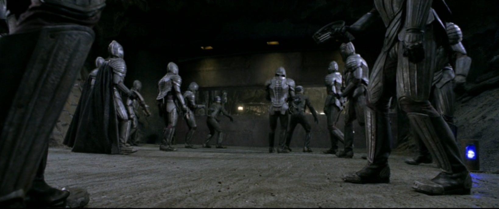 A Necromonger Captain costume and hero light-up pistol from David Twohy’s The Chronicles of Riddick. The Necromonger Captains can be seen throughout the film as they lead their army of zealots in their bid to convert the universe to their dark religion. Only Riddick (Vin Diesel) and the”breeders” stand in their way.