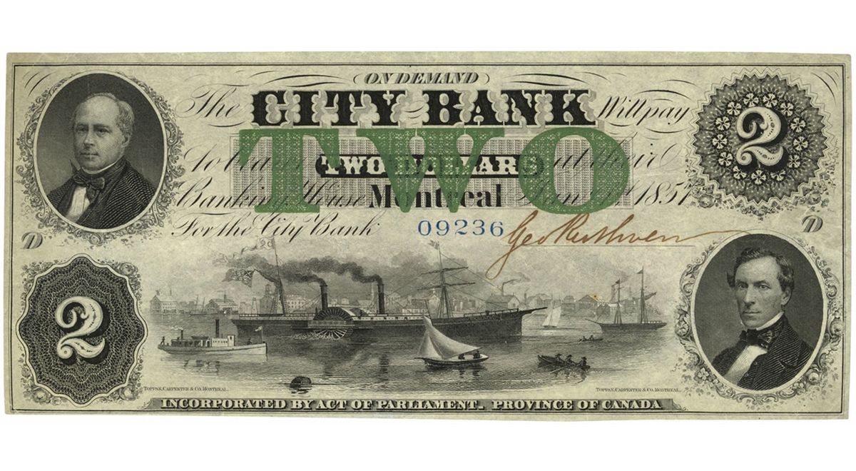 $2.00. Jan. 1, 1857. CH-110-14-02-04. No. 09236/D. Green 'word' protector on Face and in mirror image on back. Signed Geo. Ruthven at right center. A bright well centered Very Fine.