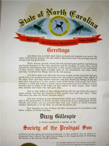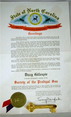 THE CITY OF CHAPEL HILL NORTH CAROLINA BRASS KEY TO THE CITY Howard N. Lee, Mayor, together with a state of North Carolina certificate for the Society of the Prodigal Son, 2 pieces