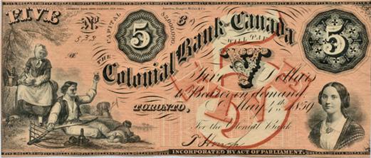 THE COLONIAL BANK OF CANADA. $5.00. May 4, 1859. CH-130-10-04-10. No. 533/C. Some pin holes. EF.