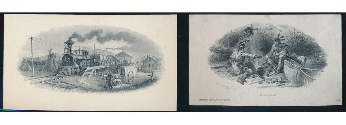 THE COMMERCIAL BANK OF MANITOBA. A vignette from the front of the 1885 $5.00 issue. 'Indian Camp', by American Bank Note Co. (9 cm x 5 1/2 cm). The F.O.C. Darley design. A vignette from the back of 1891 $5.00 issue. 'Train at Prairie Station'. (10 cm x 6 cm). Lot of two (2) vignettes.