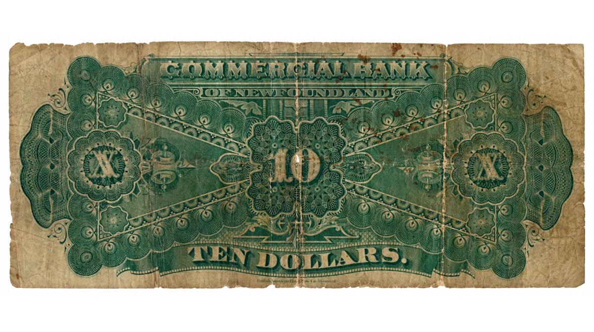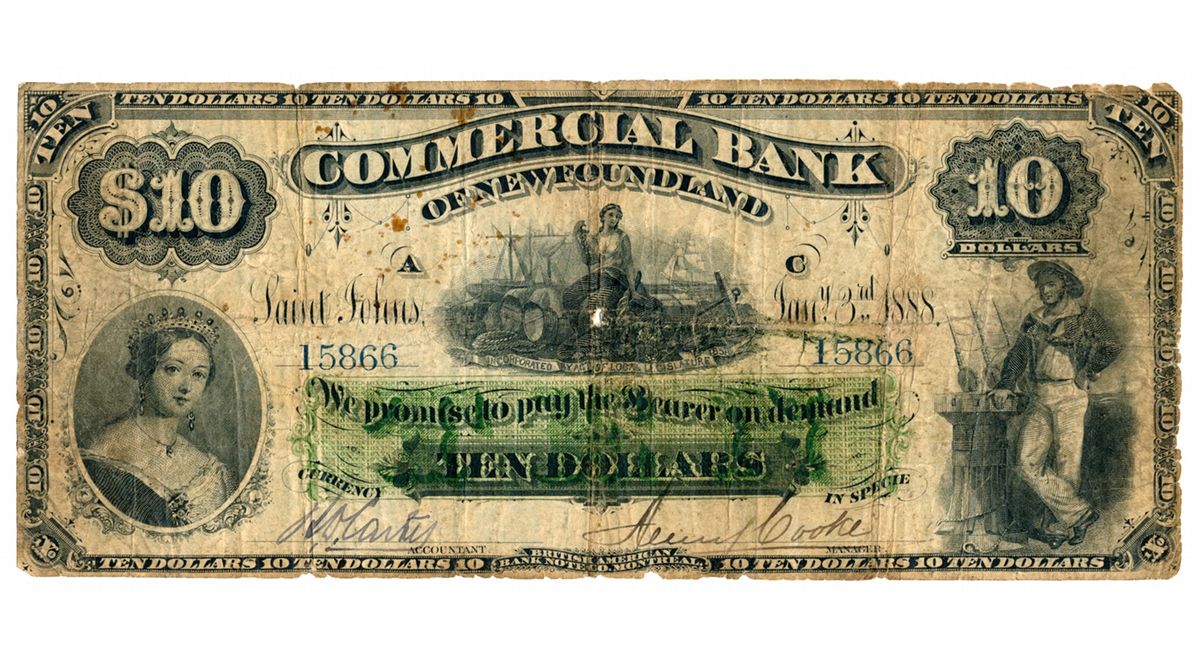 THE COMMERCIAL BANK OF NEWFOUNDLAND. $10.00. Jan. 3, 1888. CH-185-18-08. No. 15866/A. Signed Carter/Cooke. Small hole at center of note. An overall VG. Ex. MOORE's Torex, June 15-16, 2001.