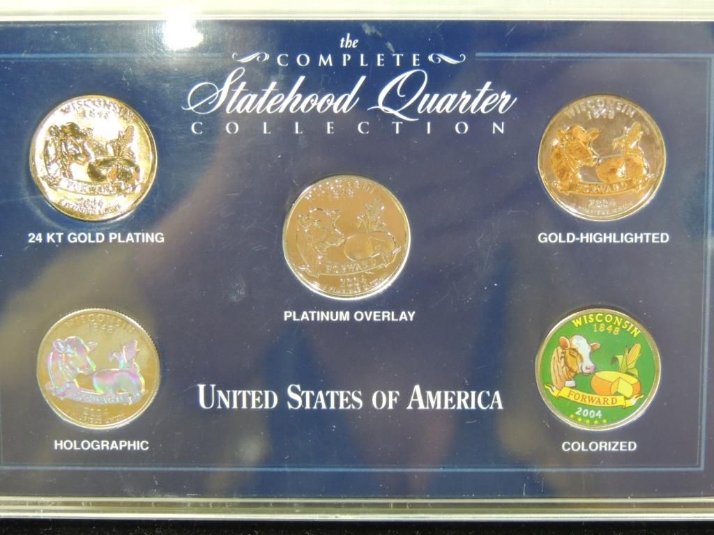 WISCONSIN STATEHOOD QUATER COLLECTION. 24KT GOLD PLATING, PLATINUM OVERLAY, GOLD HIGHLIGHTED, HOLOGRAPHIC COLORIZED. AS SHOWN. SEE PHOTO FOR MORE DETAILS.
