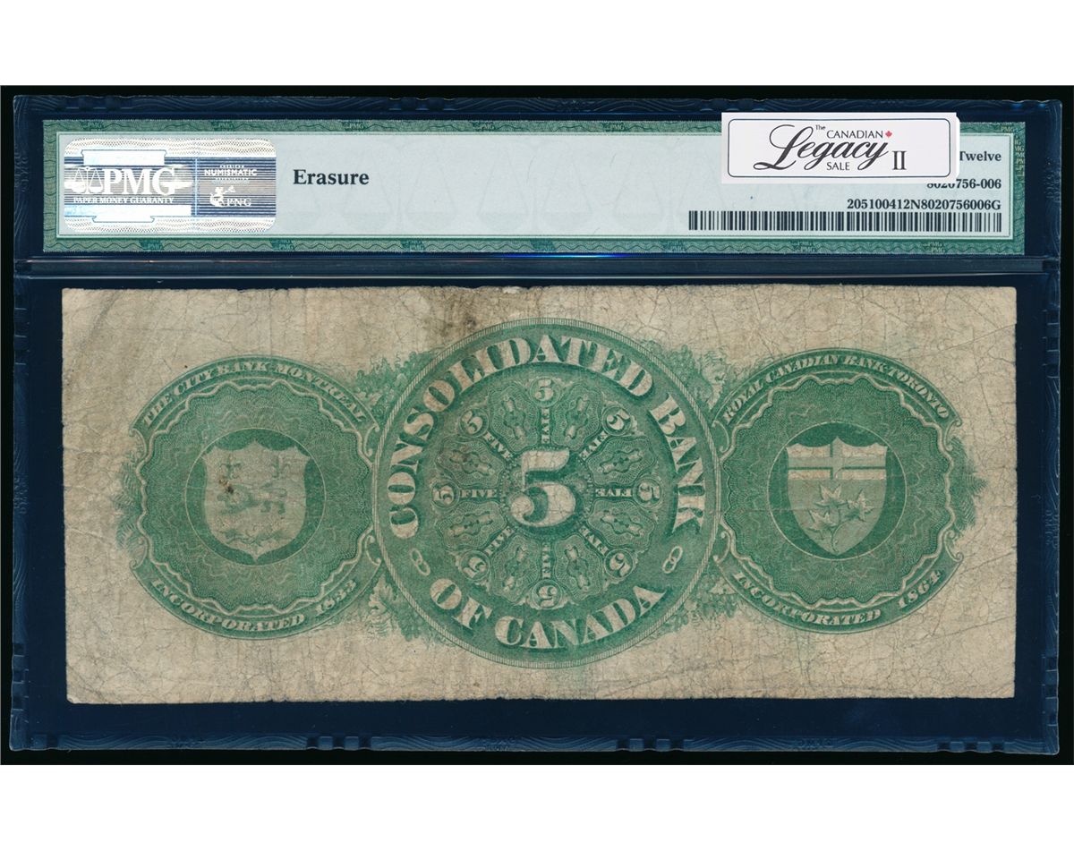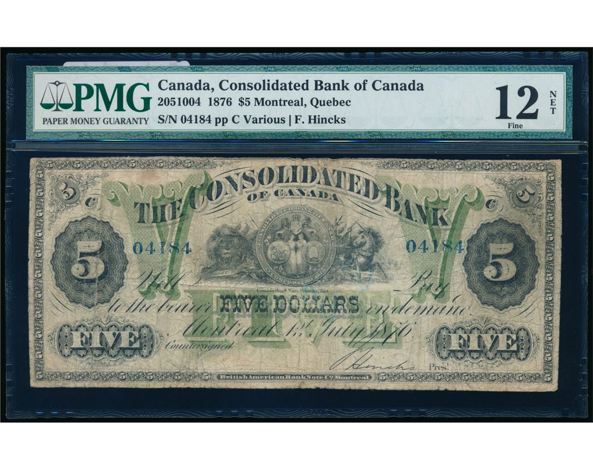 THE CONSOLIDATED BANK OF CANADA. $5.00. 1st July 1876. CH-205-10-04. F. Hincks. No.04184/C. PMG graded Fine-12 NET. (Note: erasure).