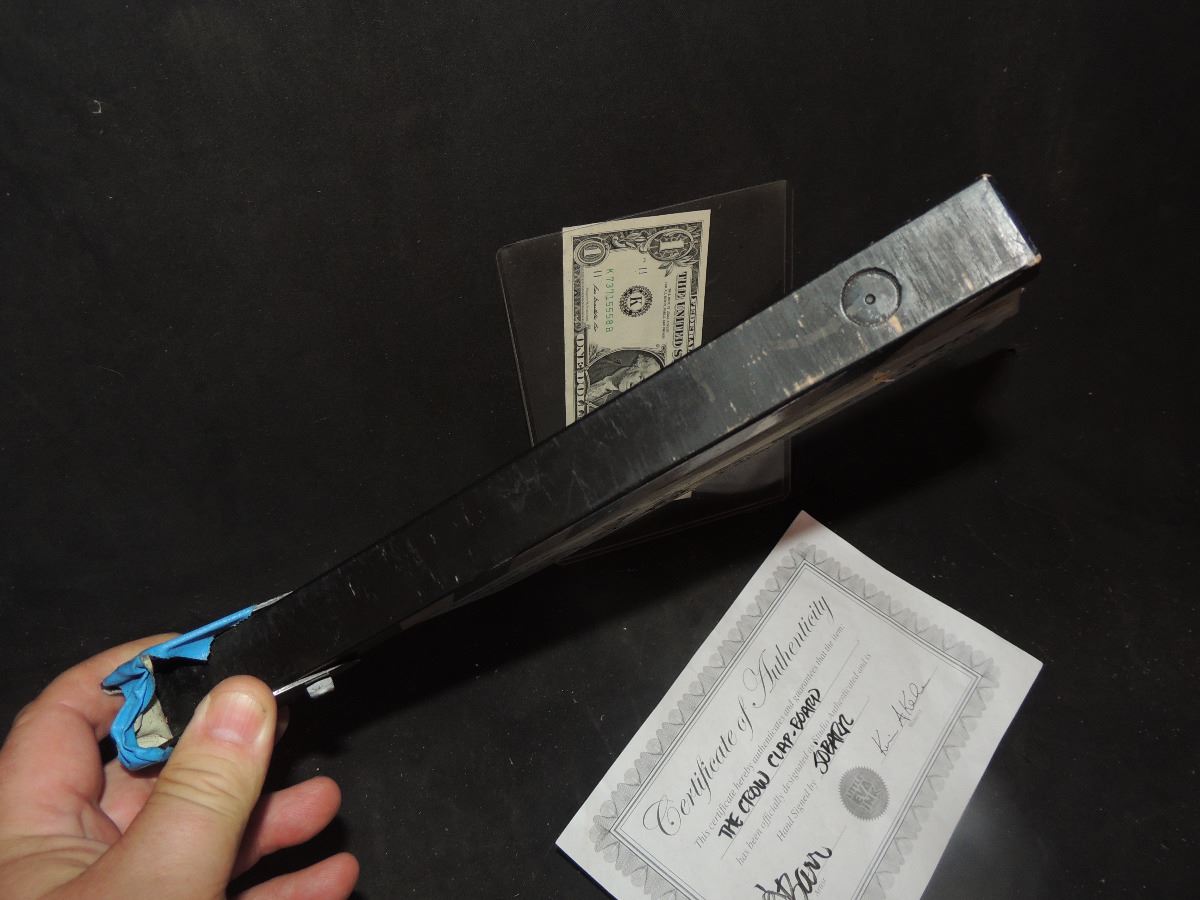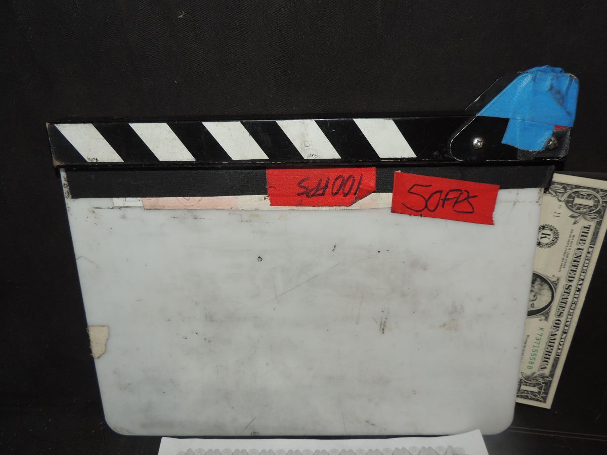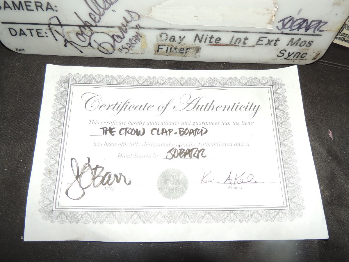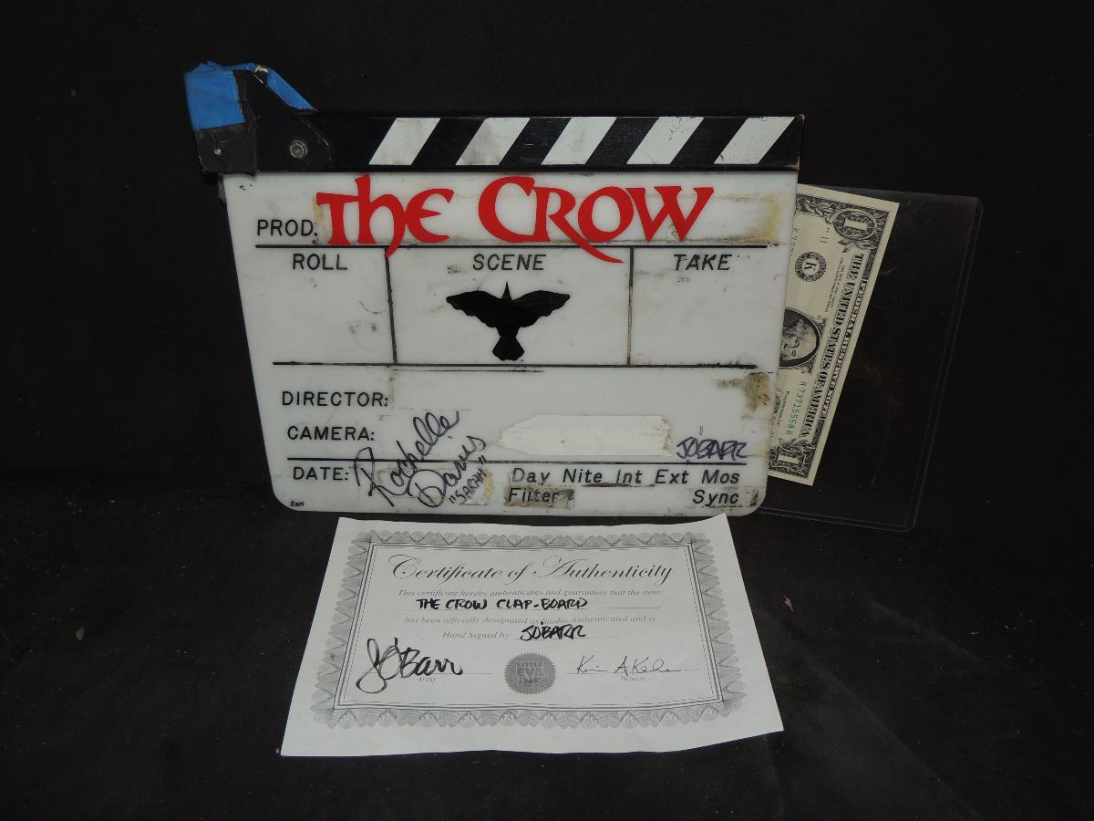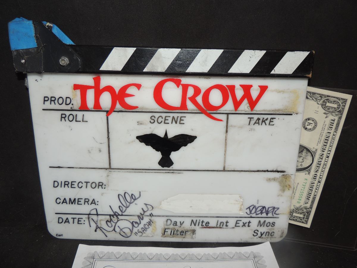 Clapper board from the first CROW movie. Still has tape. Shows extensive wear from use, and is in fact broken as you can see. Signed by the creator who also provides an LOA. According to him, this was used up until that fateful day Brandon Lee was shot.