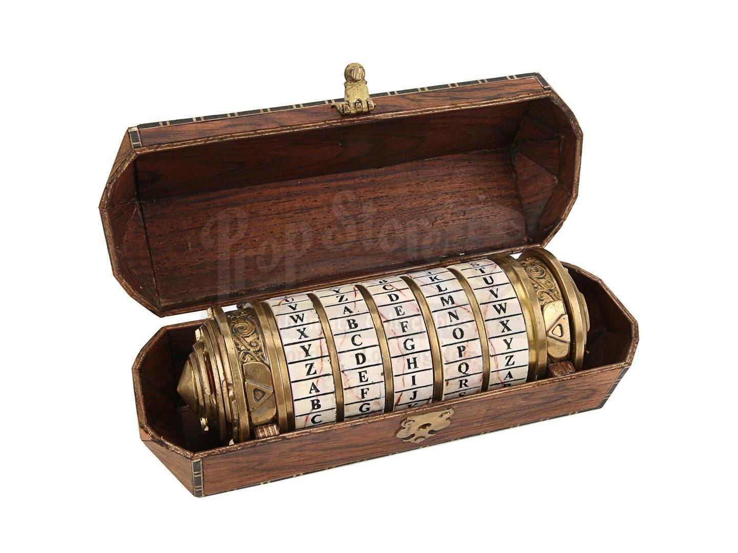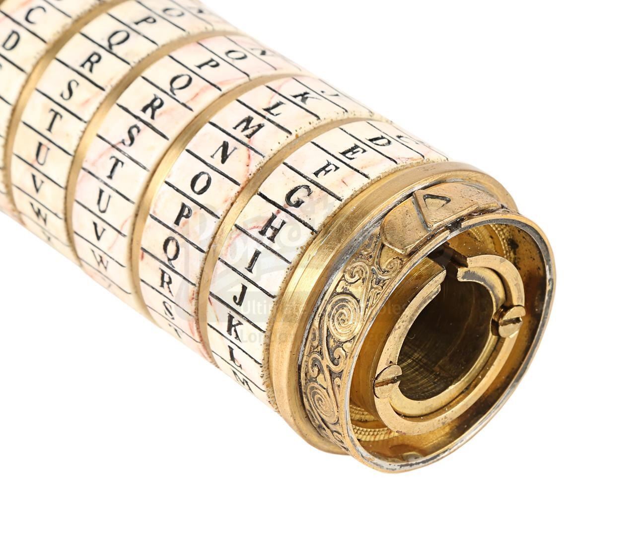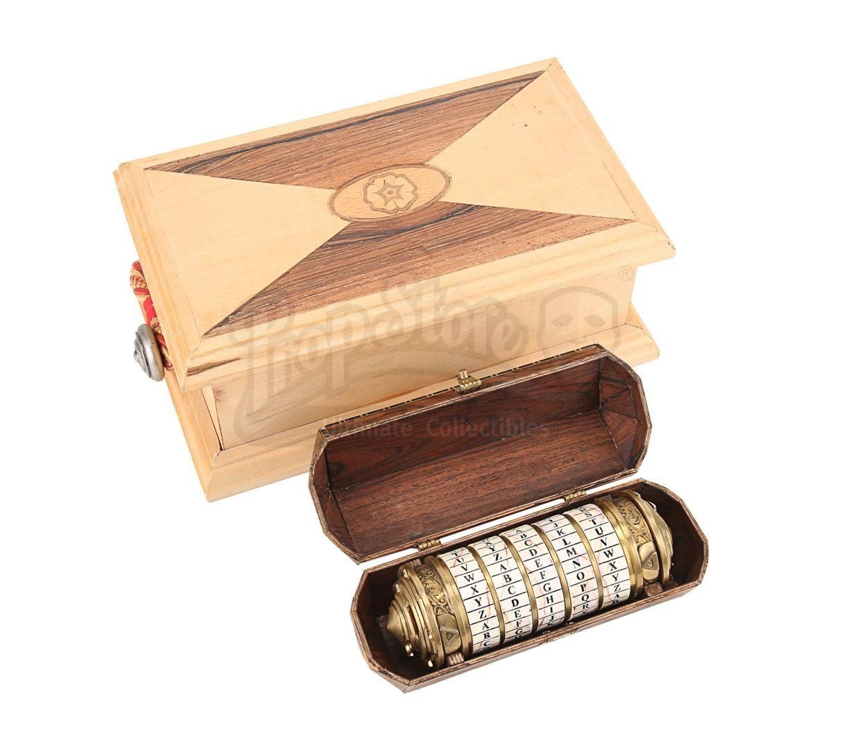 A functional hero cryptex and box from Ron Howard's thriller The Da Vinci Code. Essential to the film's plot, the cryptex required a five-letter code to reveal its contents: a papyrus message wrapped around a vial of vinegar. It was first discovered in a safety deposit box in the Depository Bank of Zurich by Robert Langdon (Tom Hanks) and Sophie Neveu (Audrey Tautou). After secretly figuring out that the code was "APPLE" and removing the papyrus, Langdon threw the cryptex into the air, knowing its contents would appear destroyed by the broken vial when it hit the ground, thereby preventing Sir Leigh Teabing (Ian McKellen) from learning the message within.