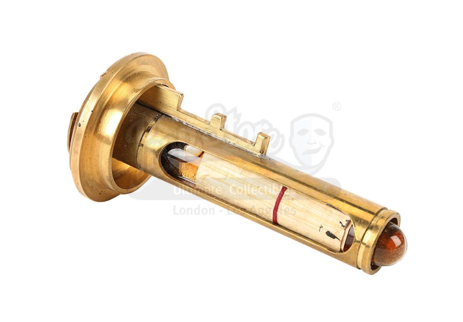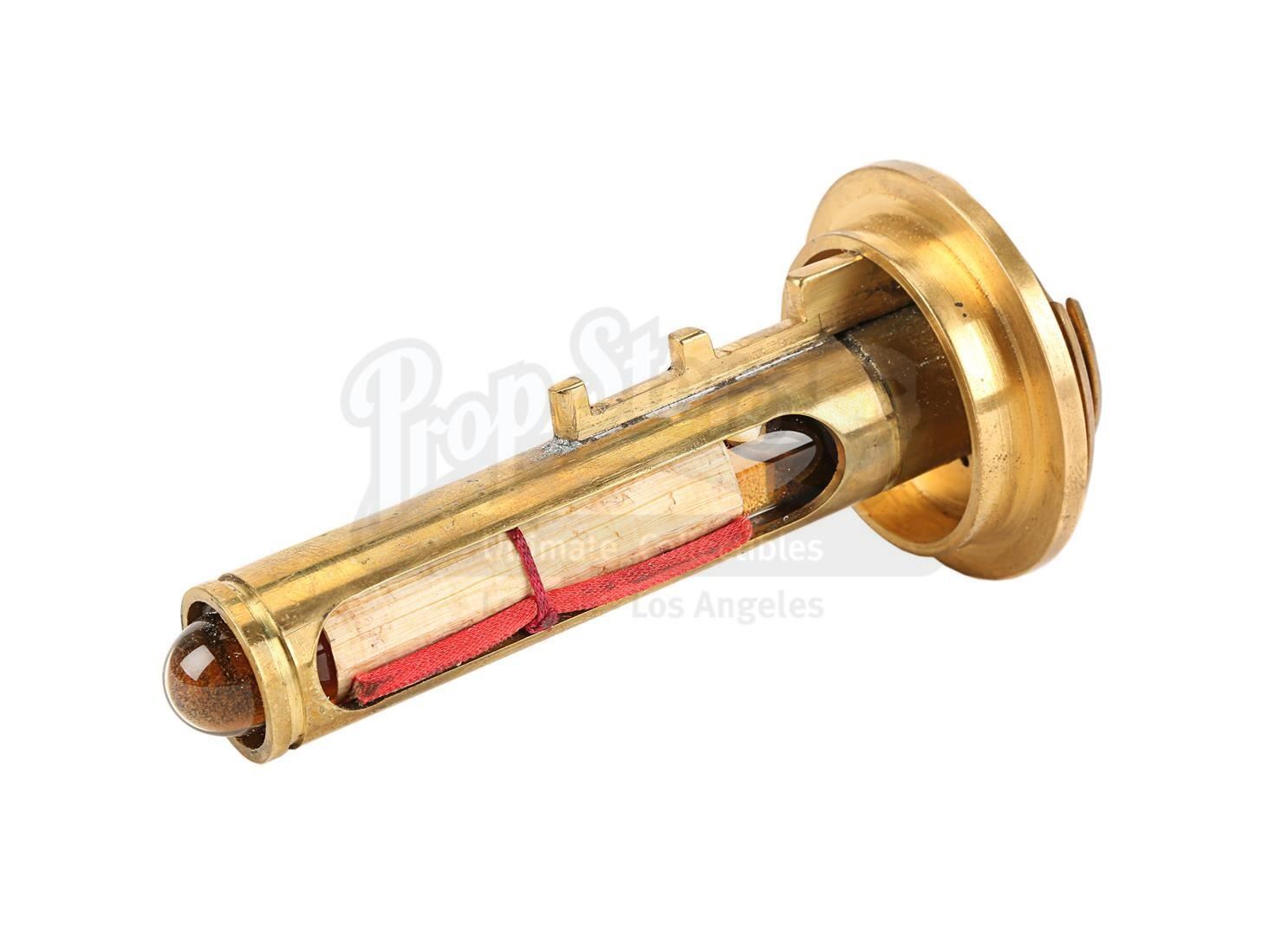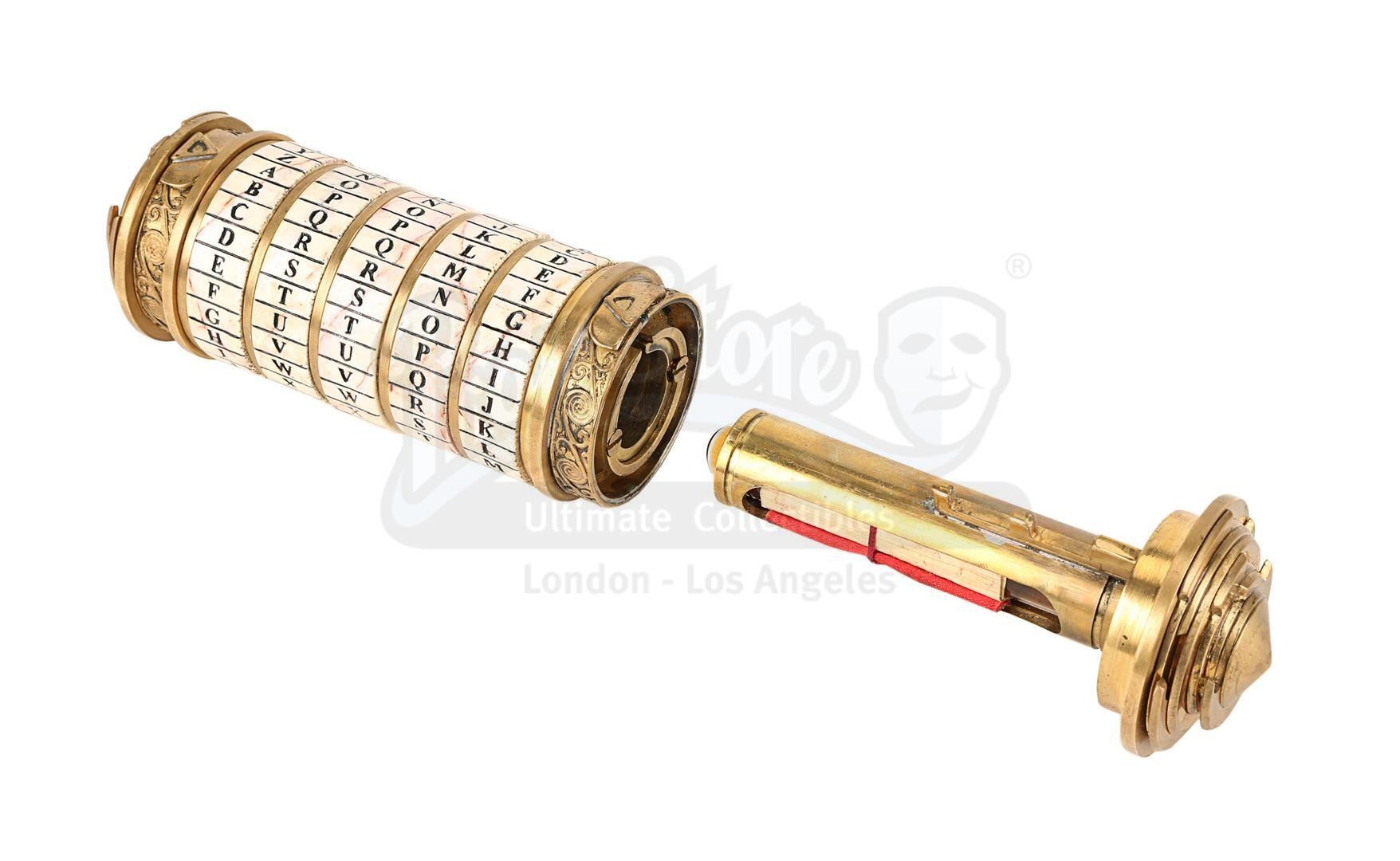 A functional hero cryptex and box from Ron Howard's thriller The Da Vinci Code. Essential to the film's plot, the cryptex required a five-letter code to reveal its contents: a papyrus message wrapped around a vial of vinegar. It was first discovered in a safety deposit box in the Depository Bank of Zurich by Robert Langdon (Tom Hanks) and Sophie Neveu (Audrey Tautou). After secretly figuring out that the code was "APPLE" and removing the papyrus, Langdon threw the cryptex into the air, knowing its contents would appear destroyed by the broken vial when it hit the ground, thereby preventing Sir Leigh Teabing (Ian McKellen) from learning the message within.