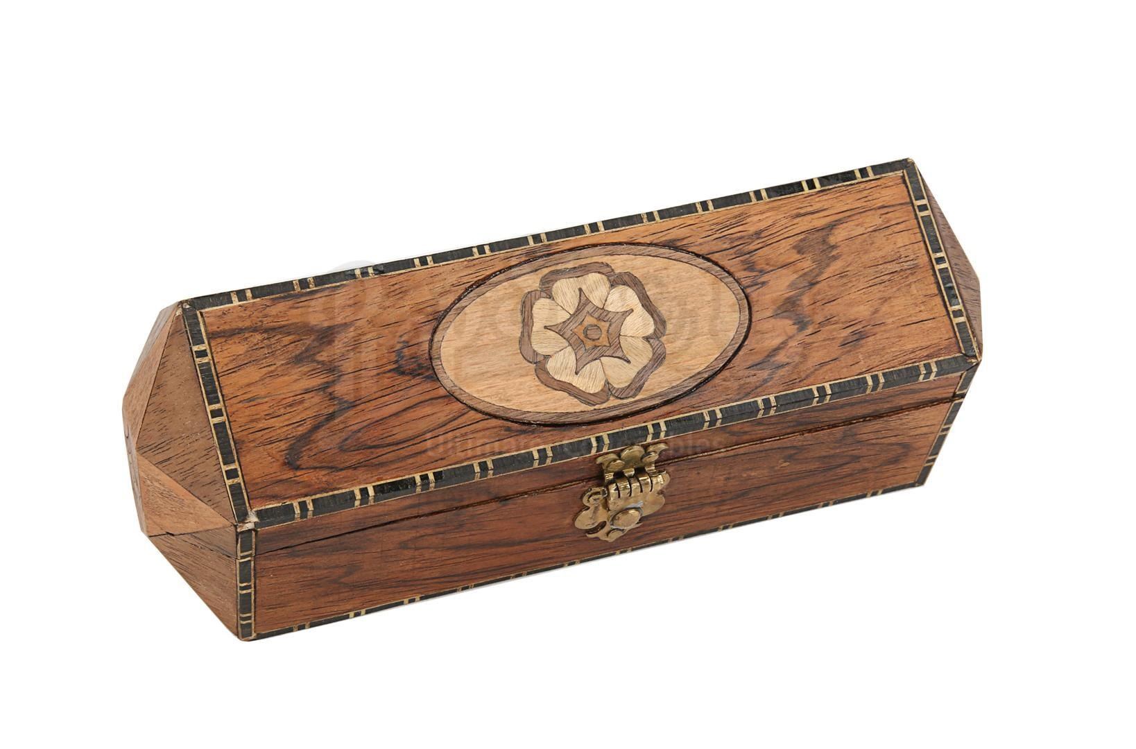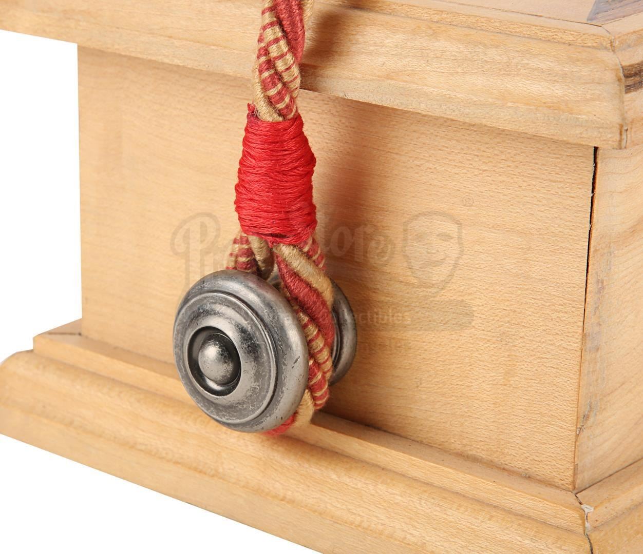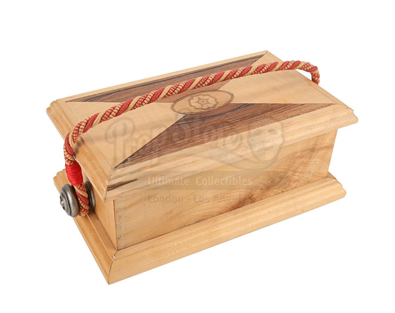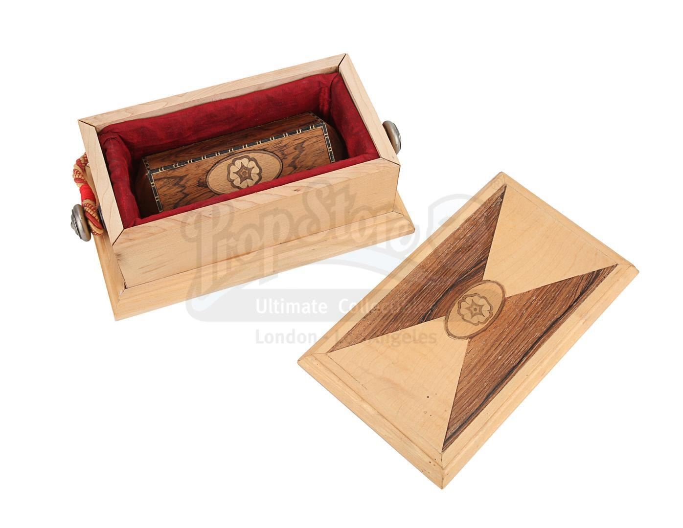 Both items are presented in a larger rectangular wooden presentation box, finished in light-coloured staining, with the same rose emblem adorning the top of the lid. This box was made when the cryptex was gifted to a senior crew member at the end of the production. Minor signs of wear are present on the marble-like finish, some of the dials are easier to twist than others, and there is minor damage to some of the corners on the rosewood box. This lot is delicate and should be handled with care. Dimensions (cryptex): 5 cm x 14 cm x 5 cm (2" x 5 1/2" x 2"); (rosewood box): 7 cm x 16.5 cm x 6 cm (2 3/4" x 6 1/2" x 2 1/2"); (large box): 26 cm x 14 cm x 11 cm (10 1/4" x 5 1/2" x 4 1/4")