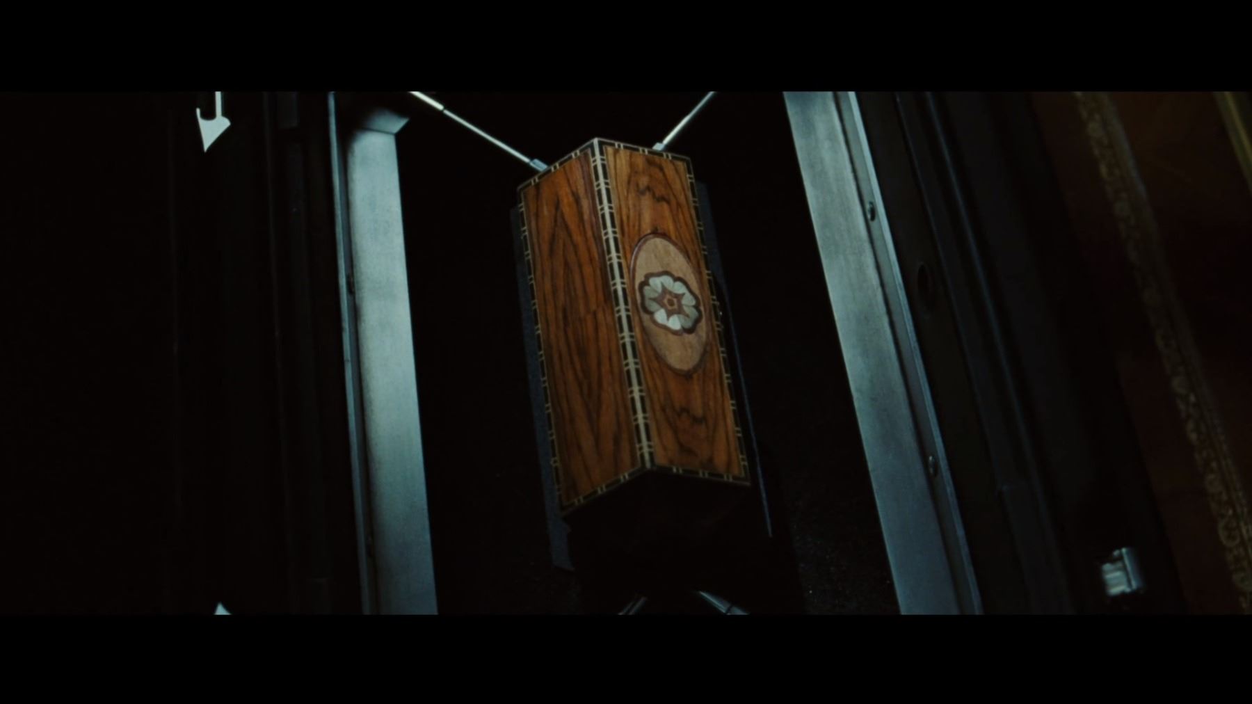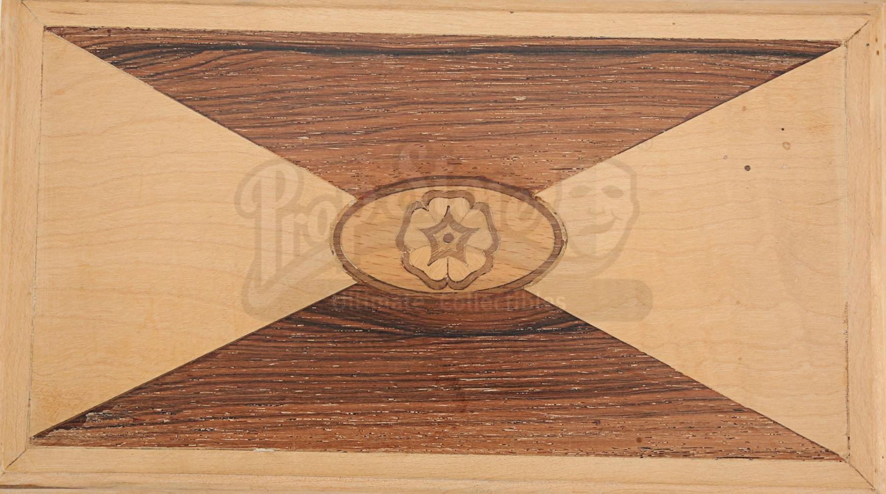 The pentagonal box is made from rosewood, and is decorated with a removable wooden oval featuring a rose emblem, a metal clasp fastening, and faux-gold metal fleur-de-lis hinges. The reverse of the oval is made of brass and features the clue etched in mirrored writing, rendered in da Vinci's style.