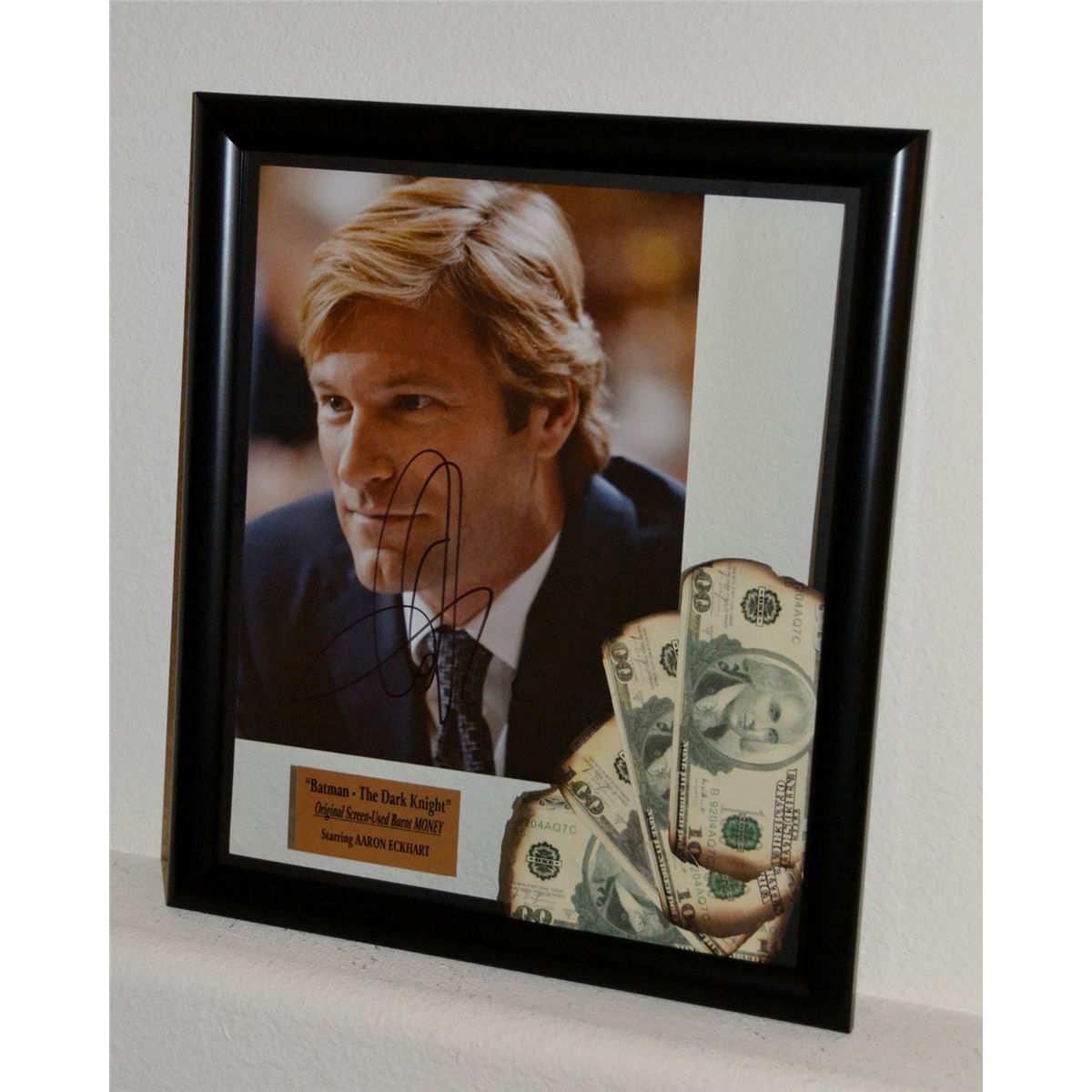 This is several burned $100.00 bills screen used in THE DARK KNIGHT framed with a signed photo of Two Face actor Erin Eckart.