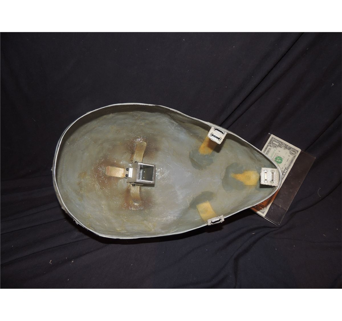 This is the hero head from Klaatu's alien bio suit used in THE DAY THE EARTH STOOD STILL. Has straps to secure it to the suit and an insert to secure it to the actor's head gear.