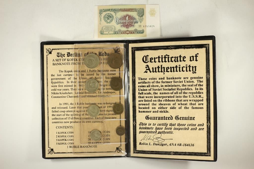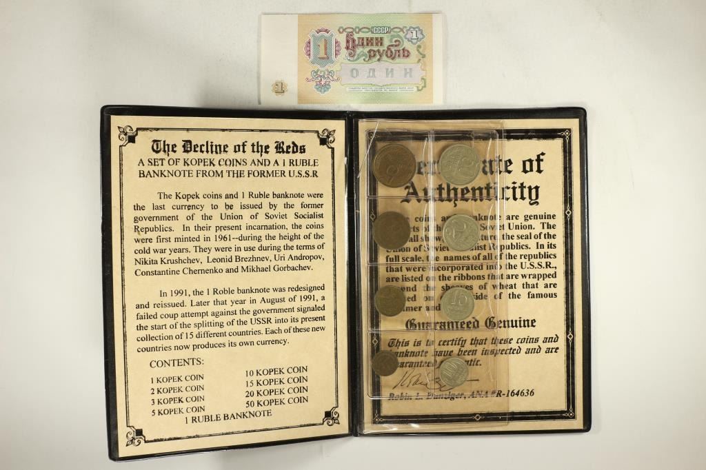A ONE RUBLE BANK NOTE FROM THE FORMER USSR. 8 COINS AND BANK NOTE IN FOLIO
