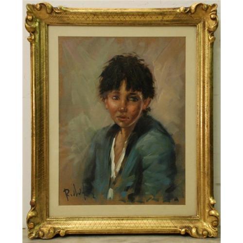 DESCRIPTION: THE DESPERATION. Touching and realistic portrait of boy, painted by the famous artist Salvatore Rodriquez. The eyes communicate more than they want and in a moment we are catapulted into a reality of poverty and hunger; his gaze is so piercing that seems to ask observer for a help. In his figure everything calls piety: the curved shoulders, the shine eyes, the torn clothes, the untidy hair and the mouth half-open as if he?d like a silent cry of pain. The large and dense brushstrokes are used in order to emphasize the contrast with the undeniably childish features.