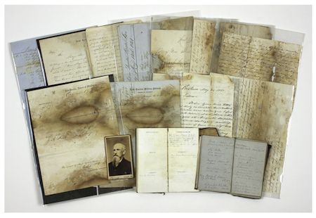 (1830-1895) Civil War politician, soldier and adjutant general from Rockland, Maine; Chief of Artillery under Edward O. C. Ord, later raised a regiment of "colored" artillery to defend the city of Knoxville. An interesting grouping of material, including two diaries with routine content, two A.L., a 29pp. A.Ms. with excellent content on slavery and politics, war-date documents to Tilloson and more. The first diary is from 1857-1860, during Tillson's tenure in the Maine legislature and one year before being named adjutant general. The small leather-bound book with blue pages is filled with Tillson's penciled notes about salaries, receipts, and other financial matters. Typical entries read: "...Oct. 11 Paid Silson to Bond...10.00 Richards 5 days 18. 75...Received for Rock 1406 casks 63.37...Dec. 23 Paid Stevens...Apr. 8 Planted...Bed Tomato, Squash, Cabbage...June 9 Paid for...carts and plow for drain...Dec. 17...completing...blacking on Common Roads..." and so forth. The second diary is from 1860, also leather-bound and signed by Tillson on the interior closure flap, also filled with penciled notes at the end of his tenure in the Maine legislature and just before his joining the 2nd Battery 1st Maine Mounted Light Artillery. In small part: "...Dr. to cash on hand $23.00...paid Capt. [Michael] Boyce bill for transportation 15.00...[Jan. 9] Paid Wm. E. Kimball Arsenal Keeper $364.86...Steamer Danl. Webster 36.75...[Jan. 27] Eyelet punch 1.00 Buckskin .87 Eyelets .05...[Feb. 11] Shoeing horse...Hostler...Beef...[Feb. 22] Powder for salute 1.00 [Feb. 23] Cleaning guns...", and more. The month of May is mainly concerned with surveying, while the events of the summer months are rather sparsely noted. In the pages marked "Memoranda" that follow the diary entries are notes about Tillson's letters and receipt of letters, as well as more accounting. Along with a fascinating A.Ms. [unsigned], 29pp. 8vo., [n.d. but probably war-date], in very small part: "...Fellow Citizens, In the remarks which I propose making upon this occasion, I can hardly expect to be able to speak to you upon subjects...which you are not already familiar. Great crises in the affairs of men or nations have always produced the men eminently fitted for the occasion...Men whose hearts have burned for freedom as if touched from fire off the alter. Men whose glorious words in behalf of justice and humanity form a part of the proud history of our...Country and who have discussed the great questions which now agitate the nation so completely...although these questions may become old and commonplace, they can never become uninteresting. Out of them will spring the issues of life and death...Never while the human race shall continue to love freedom and justice and to hate oppression and tyranny...shall the great question...become obsolete...whither the Federal Government shall continue to be the exponent and instrument of slavery, or whither it shall recognize its duties and its obligations to the 21 [?] million of American freemen who inhabit the free states...to whom...our country owes its great advancement in material prosperity and civilization...men who have poured out their blood like water, who have given up their lives rather than dishonor should come upon our flag...". Tillson goes along to give a strong critique of the government, touching upon the role of the Democrats adding: "...by the very words of Mr. [Frederick] Douglass...in his famous article Harper's Magazine that slavery was the creation of local law..." and concludes: "...Never before in the [history] of our country or the world has the issues presented before the people been of greater importance...Never before has depended upon this solution and determination so much of weal or woe to the mighty interests of our people...". Regrettably in poor state, with some paper loss and significant fading that impacts its legibility. Accompanied by a fine content war-date A.L. [unsigned] 2pp. legal folio, "Genl Qrs 4th Div. N.C. Granville, Tenn May 1865", as commander of the 4th Division of the Department of the Cumberland to Maj. Genl. George Stoneman, Union major general who led a corps at Fredericksburg, and later commanded cavalry raids at Chancellorsville, Macon, and in the Carolinas. In part: "...the 2nd and 3rd N. Carolina Regts...moved towards Bulls Gap reaching the point the same day, thence the Brigade moved to Bourbon Hills...arriving on the 20th...on the 29th the troop moved to...Round Creek...to hold the mountain passes...and the 4th Tenn. Inf. and...1st U.S.C.A. Ky. [?] to Taylorsville and vicinity and a thorough reconnaissance of the mountain made by Genl Comdg in person...strong entrenchments...erected at each of the above...the enemy at this point made a slight demonstration capturing a squad of the Cavalry attached. In compliance with instruction previously, received the command...towards Grenville, reached that place about the 20th of April...On the 6th of May instructions were sent to Col. Hawley to move the 1st U.S.C.A. Ky to Grenville at once and to send instructions to the 2nd and 3rd North Carolina to move to Asheville at once...On the 3rd of May Gen. Martin Comdg...for some reason Colonel Bartlett allowed...the men surrendered to retain their arms...he was at once [ordered?] to revoke that portion of the agreement...and to collect all the arms retained....during all the operations of the troops of the 4 Div. in the field there were no casualties except the capture of a party of the Cavalry attached. There were forty five hundred men in the command when it moved...has been considerably augmented by recruits...". Along with a second A.L.S., badly deteriorating to the point it cannot be read, and nine war-date A.L.S.s and D.S.s to Tillson, unresearched but including a retained copy of an A.L.S. by Genl. George Lucas Hartsuff, and a carte-de-visite portrait of Tillson by Ayer, Augusta Me. An interesting grouping, worthy of further research. Regrettably, m