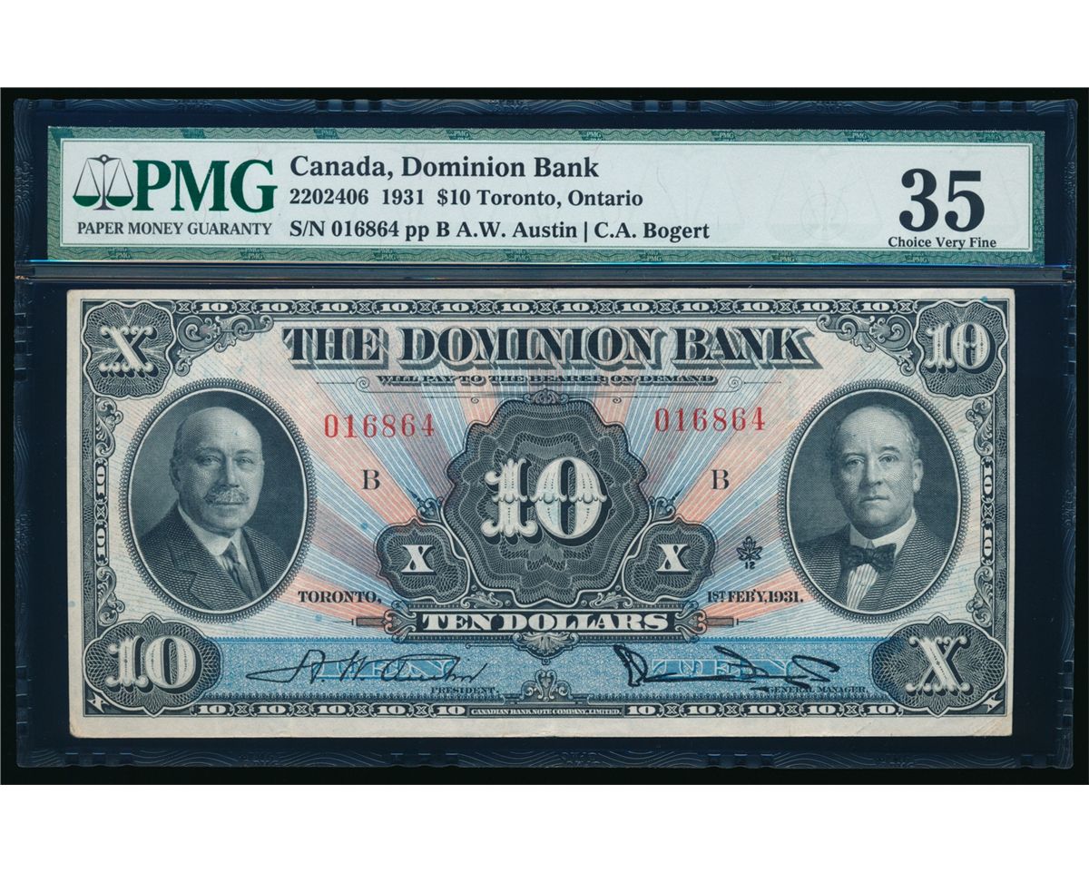 THE DOMINION BANK. $10.00. 1st FEB'Y, 1931. Toronto, Ontario. CH-220-24-06. Austin-Bogert. No.016864/B. PMG graded Choice Very Fine-35.