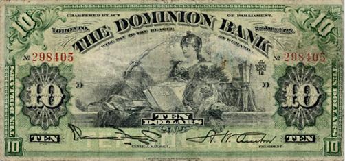 THE DOMINION BANK. $10.00. Jan. 2, 1925. CH-220-18-10. Austin, right. No. 298405/D. VG.