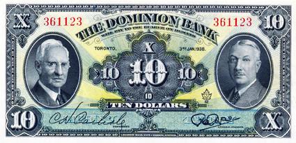 THE DOMINION BANK. $10.00. Jan. 3, 1938. CH-220-28-04. No. 361123. Crisp Unc.