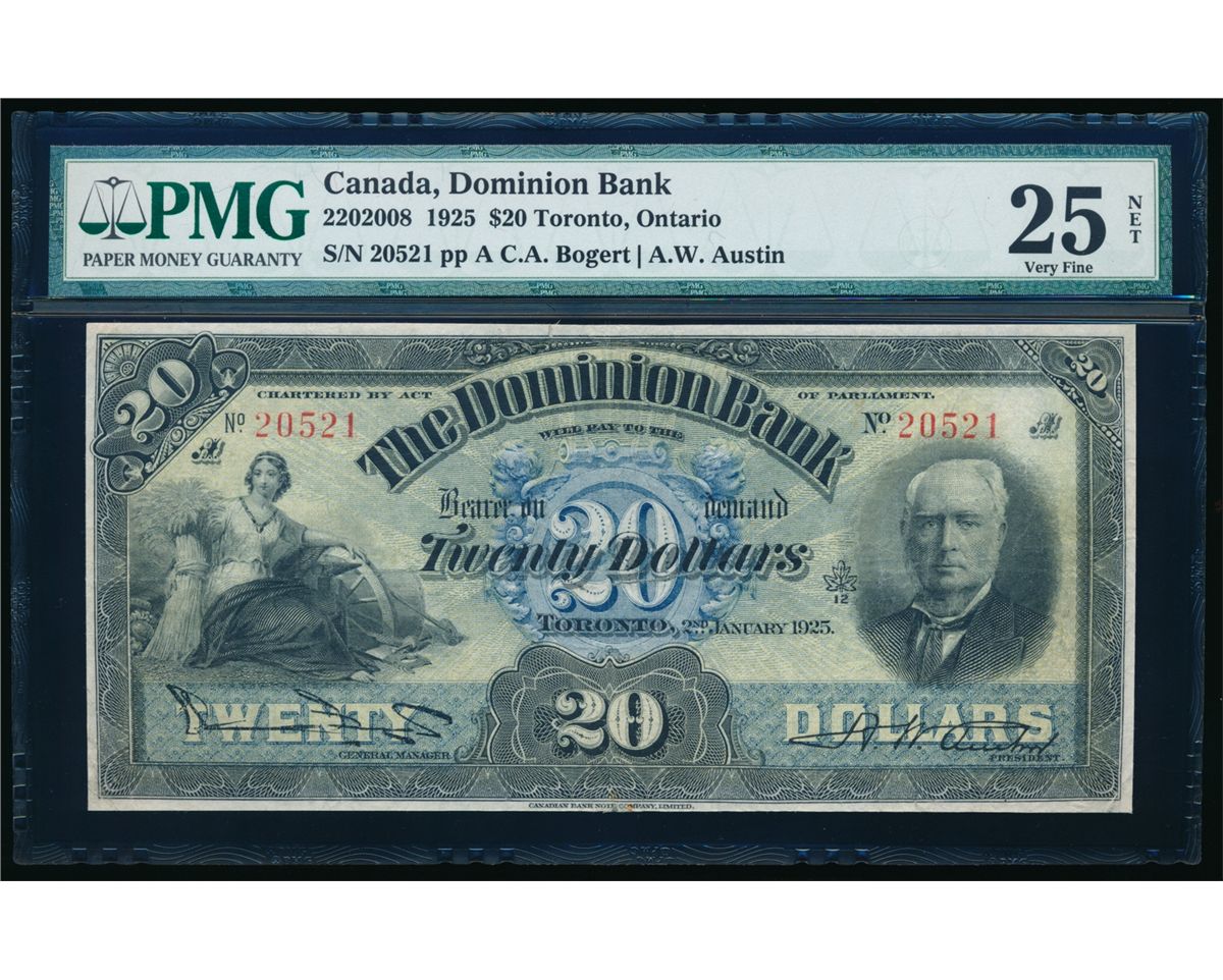 THE DOMINION BANK. $20.00. 2nd January 1925. CH-220-20-08. Bogert-Austin. No.20521/A. PMG graded Very Fine-25 NET. Toronto, Ontario. (Note: Minor tear at top margin).
